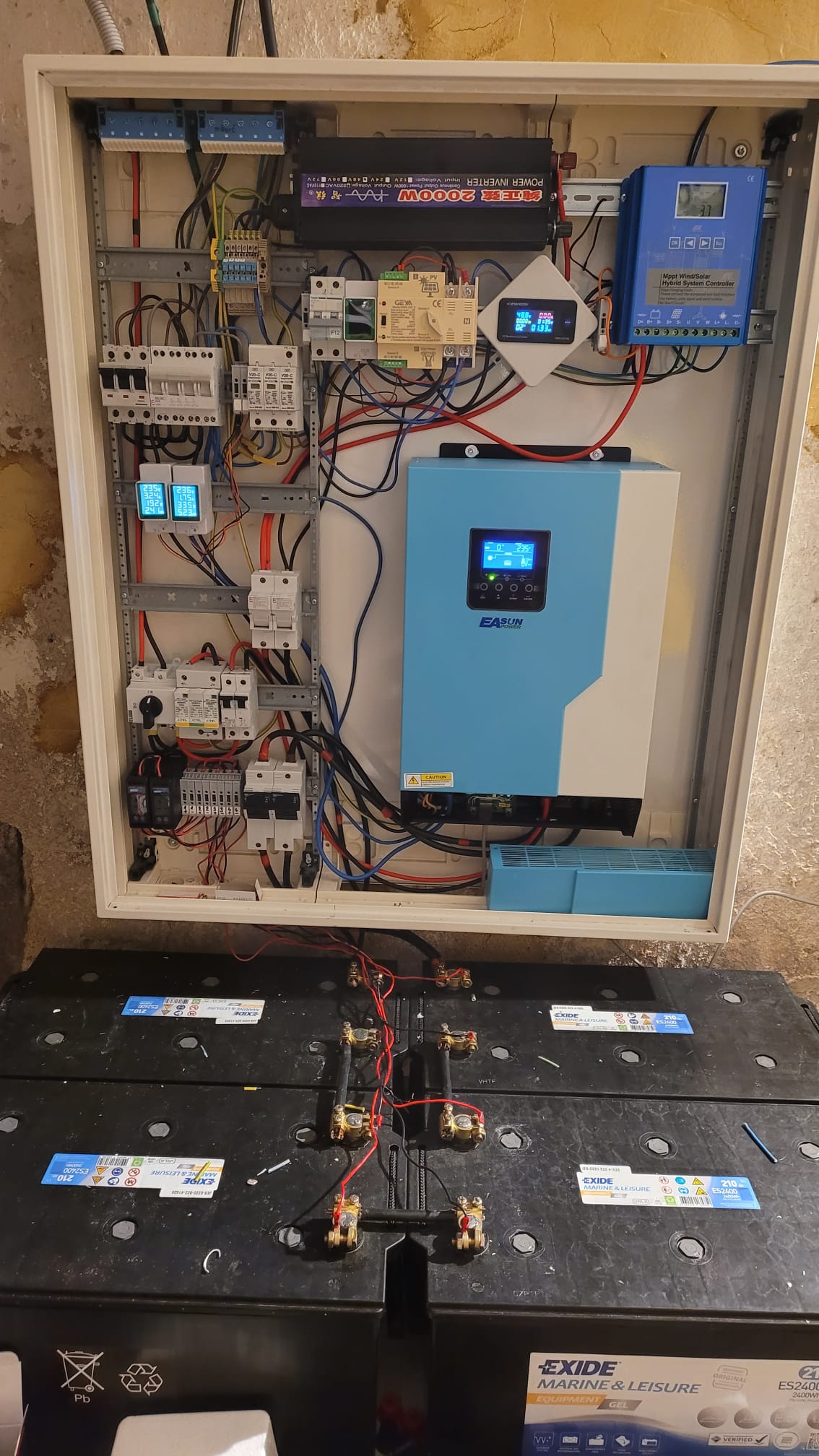 Ondrášova hybridní elektrárna je vybavena 8 solárními panely LEAPTON o celkovém výkonu 5200 Wp a bateriemi Exide GEL 210 Ah s kapacitou 10 kWh. Srdcem systému je jednofázový hybridní regulátor EASUN SML III 5500W MPPT, který neodesílá přebytky do distribuční sítě, což zajišťuje efektivní využití energie pro domácnost. Systém je doplněn o balancer baterií a plánovaný měnič 48V na 230V pro napájení motoru vrat a vodárny. Uživatelé diskutují o provozu měniče, komunikaci s BMS a optimalizaci odběru energie.