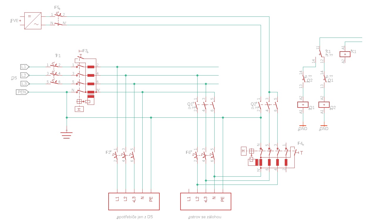 Zdravím pro přepínání 1f měniče a 3f rozvodu vše v TN-C jsem k rodičům udělal přepínač z reverzačních stykačů a mechanických západek. Zatím tedy vyzkoušeno jen v rozvaděči na stole bez zátěže a funguje to parádně, líbí se mi možnost že při přepnutí jedu na DS 3f a dále že to zároveň funguje i jako mechanický přepínač pro případ poruchy. Chtěl bych stejný přepínač udělat i k sobě na TN-S kde momentálně mám manuální přepínač sítí ABB OT80F3C s N kontakty s předstihem a přepínám i N. 1f FVE a v případě odtavení FVE 3f DS jinak pužívám bypass v Multiplusu a jedu pořád 1f. Chtěl bych se zeptat zdali je nutné u TN-S přepínat i N měniče a rozvodu? Díky moc