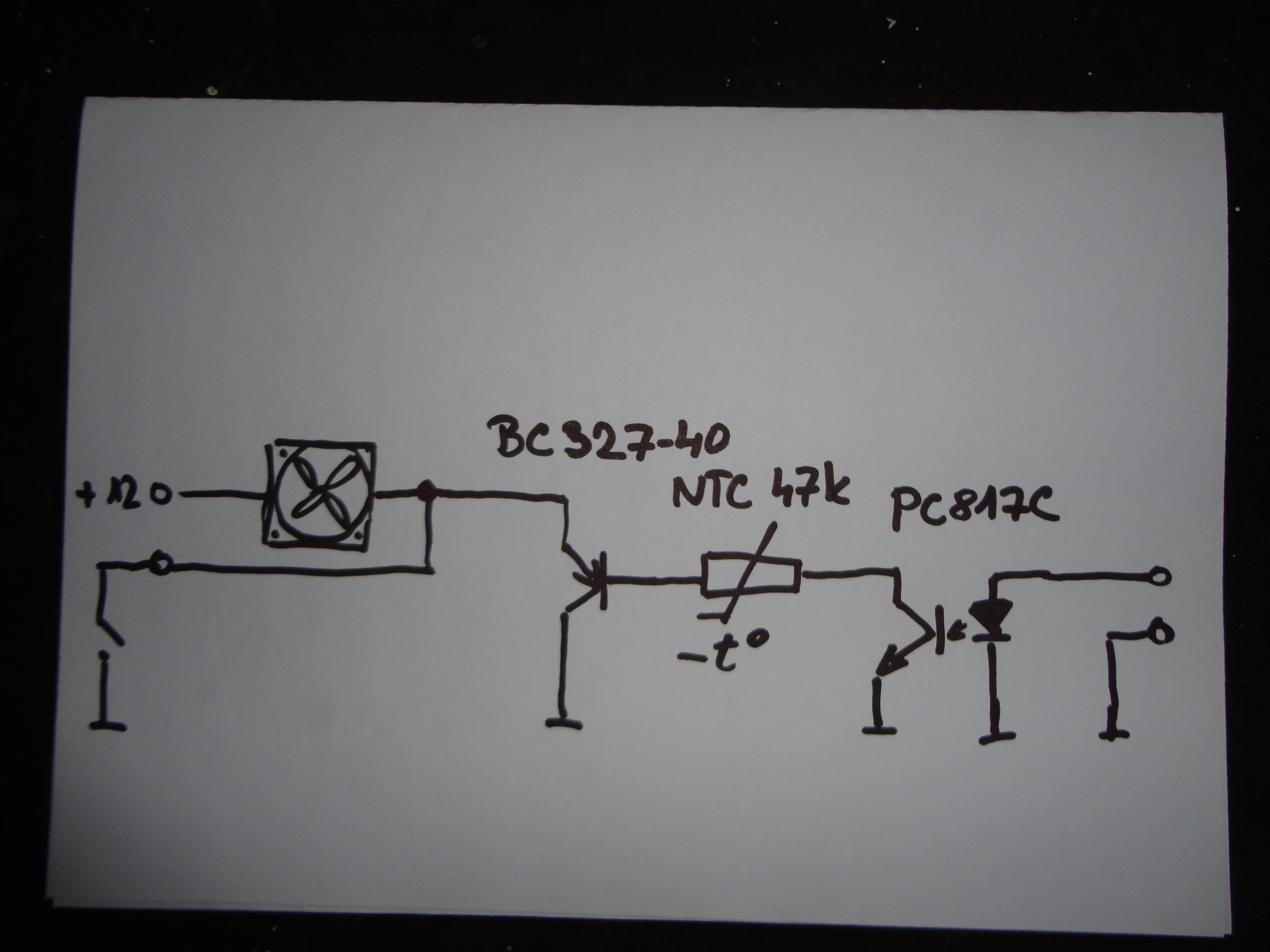 Proud ventilátorem je při 20°C 80mA. Pro můj 80x80 je to tak akorát, s originálním by stačilo 40mA, potom by to chtělo větší R termistoru. To jsem nezkoušel jen tipuji 100k. Vidím to jako určité řešení chlazení tohoto aparátu a to bez výpadků nabíjení a hučení ventilátoru. Jestli to někoho zaujalo nechť si poslouží, je to za pár Kč