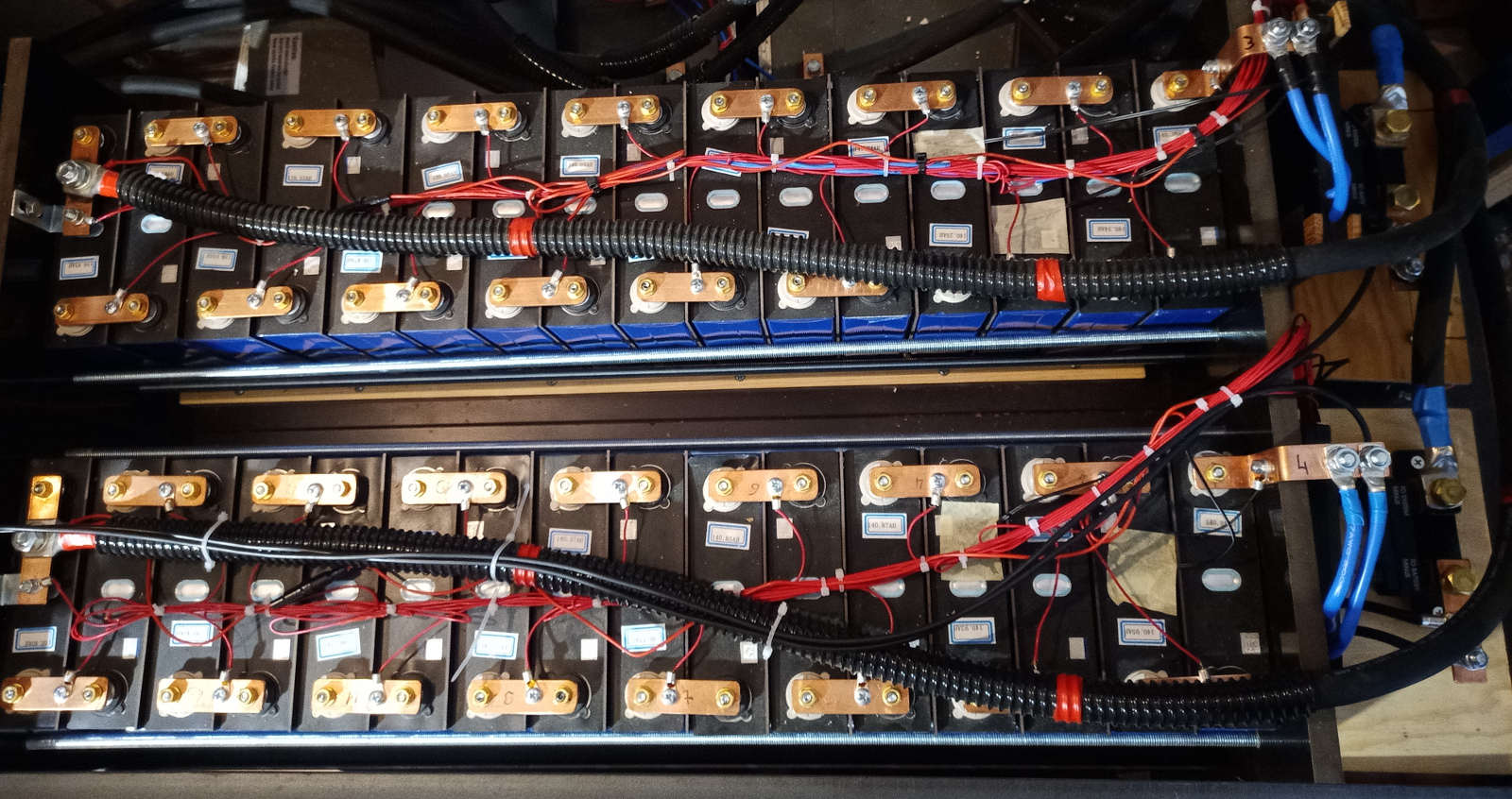 Victron Bluesolar MPPT 150/35, 2x Smartsolar 250/85. Lifepo4 48V/560Ah cca 28kWh -16x 320Ah LiitoKala ( reálna kapacita 283 - 294Ah) + 16x 280Ah Eve spolu na Victron Smartshunte.