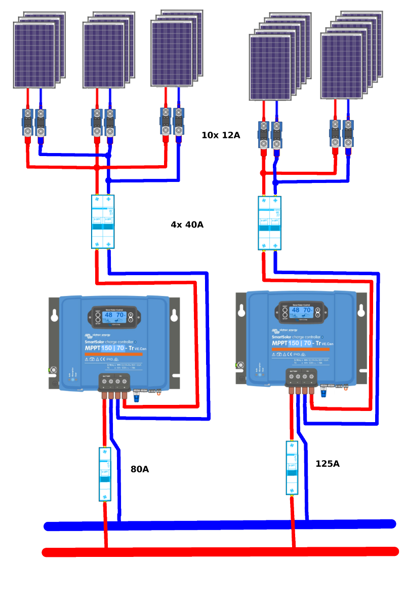 Nize nacrt jak jsou zapojene pojistky a jejich amperaz. Chybi tam prepetove ochrany a odpojovac mezi mppt a kladnou vetvi busbaru.