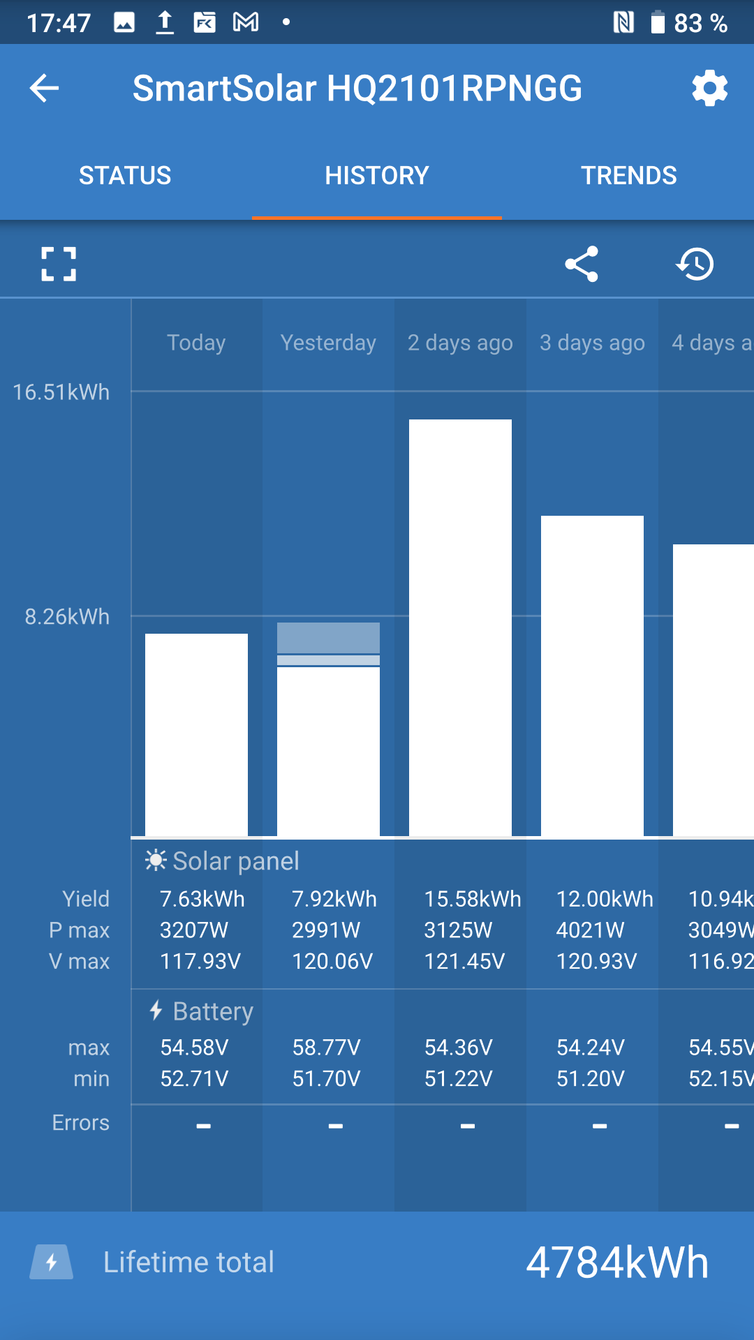 5,4 kWp JJZ 4deg,1,8kWp JV 24deg, do 13.8.2022 bylo 3,6 kWp, MPII 5k, Victron MPPT 250/85-TR, aku 9,45 kWh Lion 15S, BMS 200A, Smart Shunt 500A.