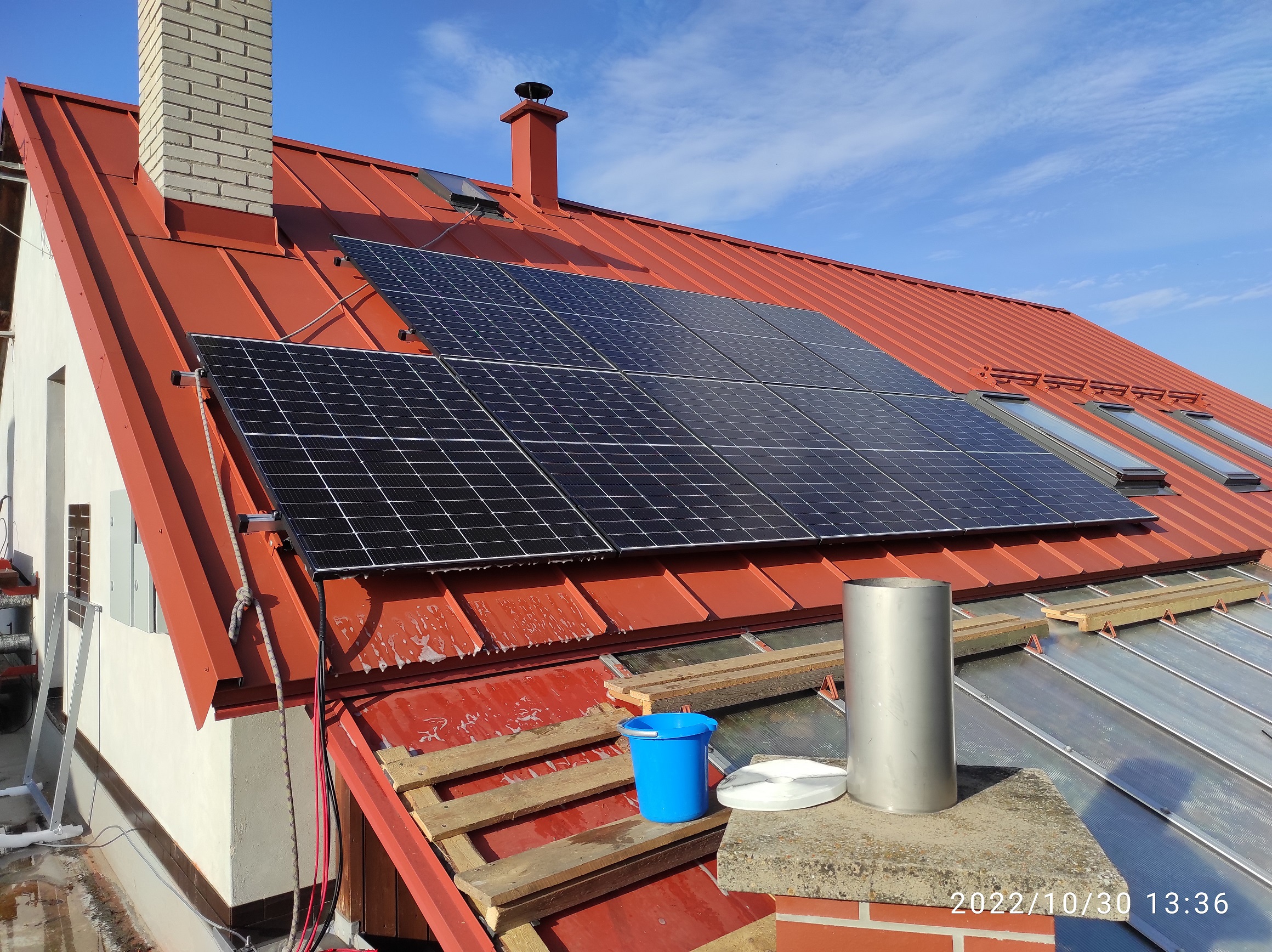 Jak už to bývá tak jsem ještě na podzim dospěl k dalšímu rozhodnutí a to že cca 2,4 kWp bude vlastně strašně málo a tudíž že další panely dám na šikmou střechu (JJV 33°) a tři do západního štítu domu. Na střechu se mi ještě před zimou podařilo umístit 9 panelů. Protože ale nemám úplně hotovou podlahu v technické místnosti, nemohl jsem tam zatím umístit baterie a nemám ani hotové zapojení rozvaděčů a přepojení odběrů v domě takže zatím jedu na 6 panelů a střídač Oplocký který mám zapojený natvrdo do akumulační nádrže na spirálu cca 2kW. vzhledem k tomu jak se zvyšuje výroba a ubývá potřeba topení tak to budu muset nějak sofistikovat abych to nepřetopil. Podlaha se už ale blíží do finiše takže brzy umístím baterie a začnu přepojovat odběry.