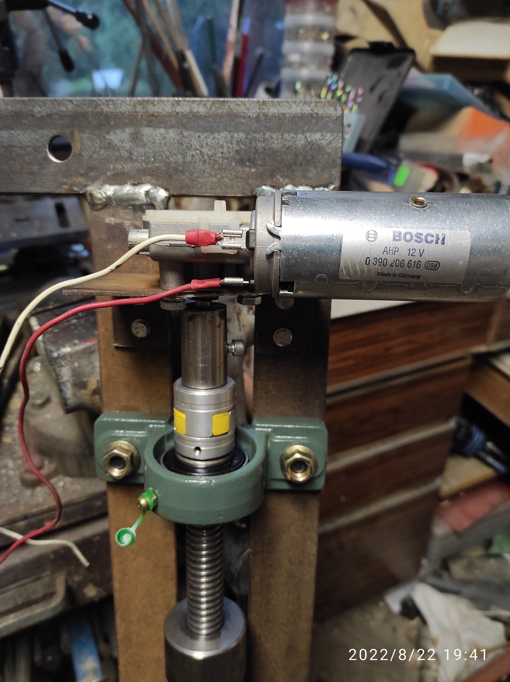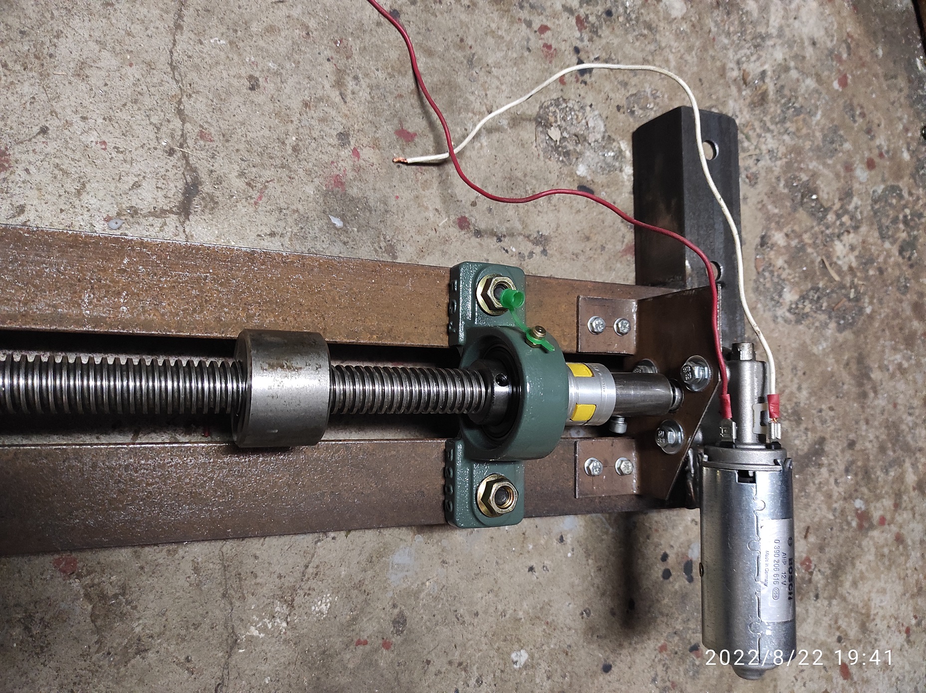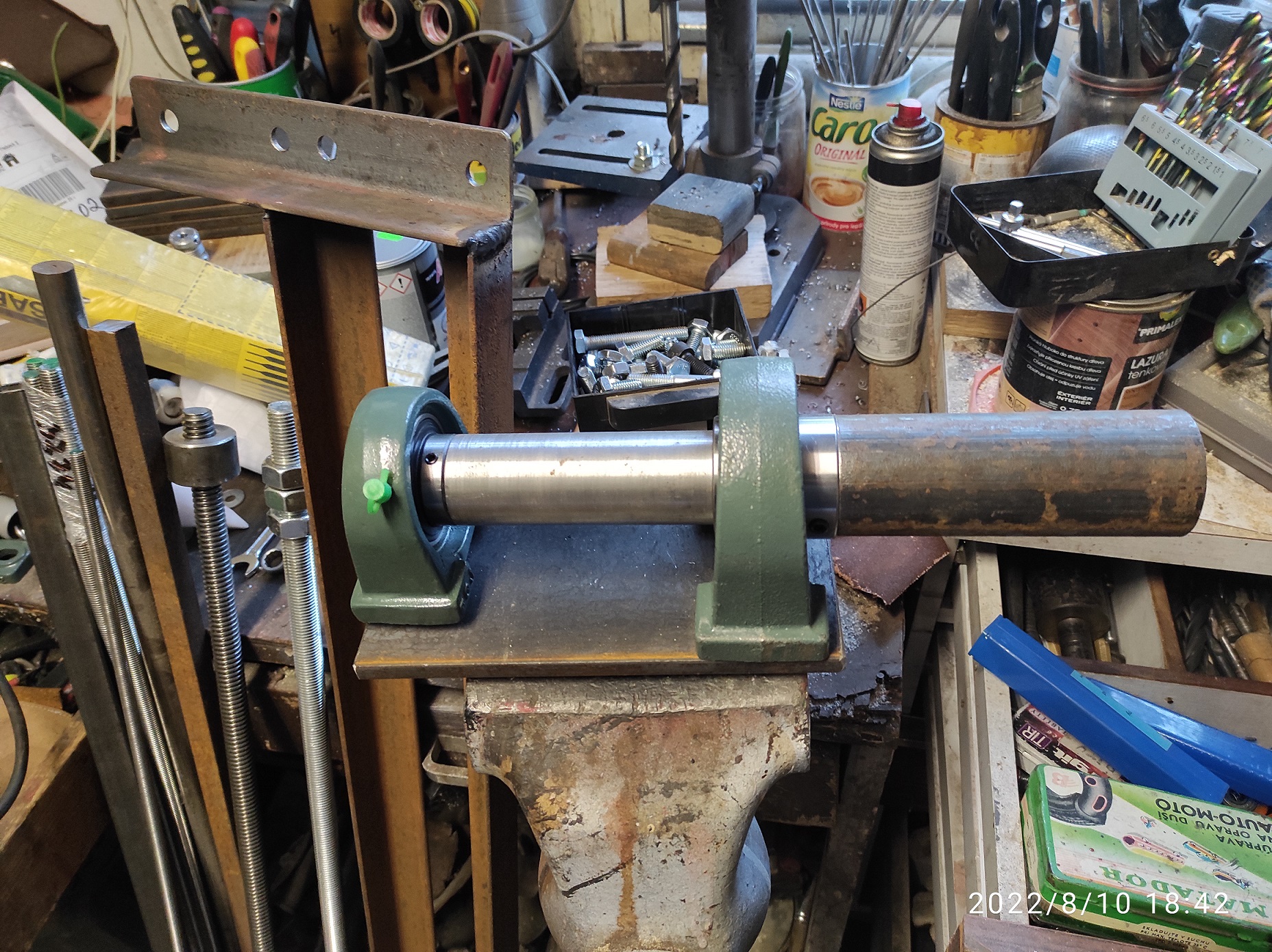 Pod každým panelem bude takové téčko na otočném čepu který bude uložen v ložiscích. To jsem "trochu" předimenzoval když jsem nejprve objednal ložiska s dírou 40mm. Když přišly zjistil jsem že je to zbytečně velký průměr a v pohodě by stačilo 30mm. Nicméně už jsem měl tak jsem je použil jako horní. dolů jsem pak dal ty menší (30mm). Čep má tedy průměr 50mm potom je stočený na 40 a nakonec na 30. Určitě by stačil čep 40 a obě ložiska 30. Na tom téčku budou sklopné rámy na kterých bude přidělaný panel takže u panelu by měl jít v určitém rozsahu upravovat i sklon - podle ročního období. To bude ale poměrně omezené z důvodu většího větru a taky pro to, že více postavené panely vrhají delší stín a mohly by si vzájemně stínit. Otáčení mám vymyšlené 12V motorkem který bude otáčet šroubovicí. Vždy tři panely v řadě budou spojeny táhlem. Prostřední panely v řadě budou spojeny táhlem na matku posunovanou po šroubovici.