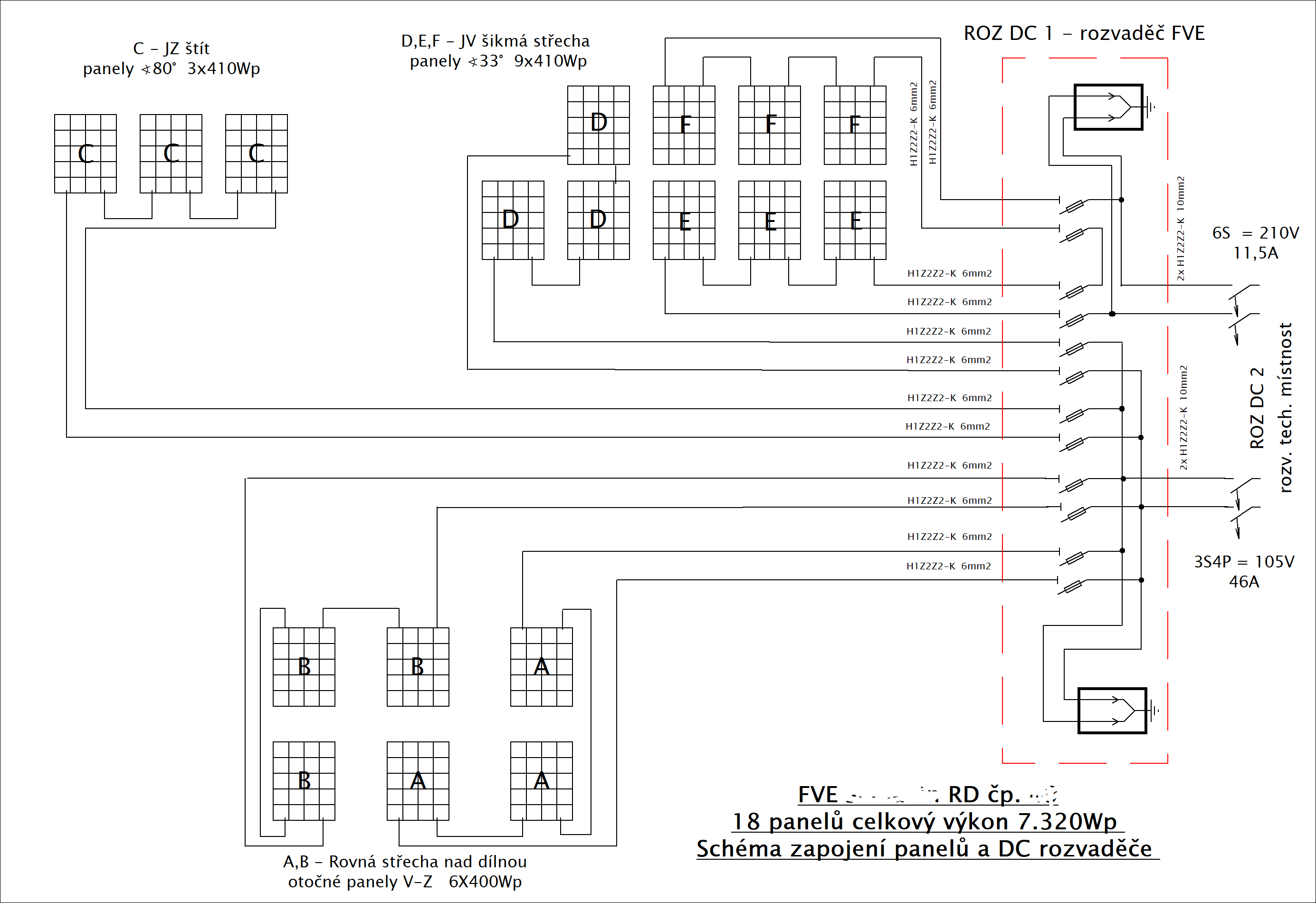 Ještě připojuji schema jak by moje FVE měla snad vypadat letos v létě. I když zapojení bude nakonec trochu odlišné. Stringy ABC budou společně do jednoho regulátoru a DEF do druhého. Takže to bude 2x 3S3P