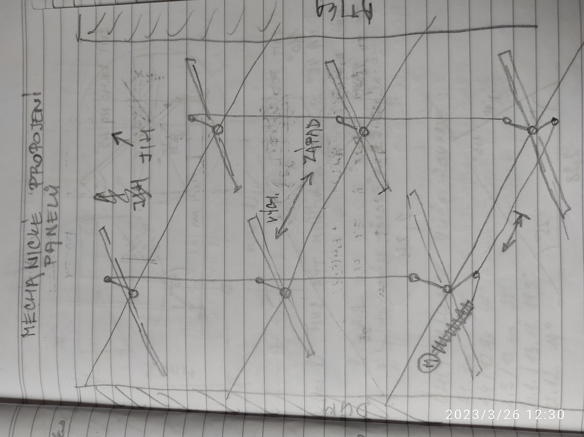 Ano bude každý panel samostatně, propojené budou táhly a budou mít jeden společný pohon. Je to takový experiment, sám jsem zvědavý jak se mi to podaří vyladit. Kvůli těm táhlům tam bude omezený rozsah pohybu na cca160° od východu k západu. Takhle jsem si to na začátku načmáral do sešitu. Panely jsem si tam nakreslil jakoby na stojato ale samozřejmě budou skloněné. Nevím ještě jak moc. Velkou roli bude hrát stín a vítr, navíc mi u jednoho krajního panelu bude vadit roh domu, prostě bojuju s místem ale jak jsem napsal jednomu kolegovi v nejhorším tam nastavím sklon 15°a zafixuji je pevně na jihPF23 píše:To se bude "natáčet" každý ten modul zvlášť? Nebo to bude jako tady https://www.youtube.com/watch?v=FPkajCvK2Mk ?