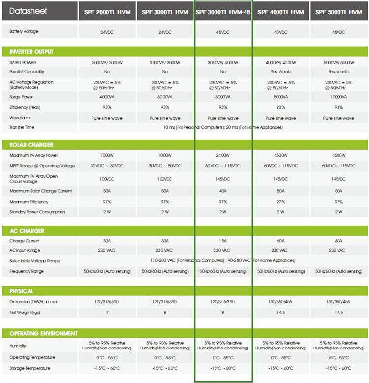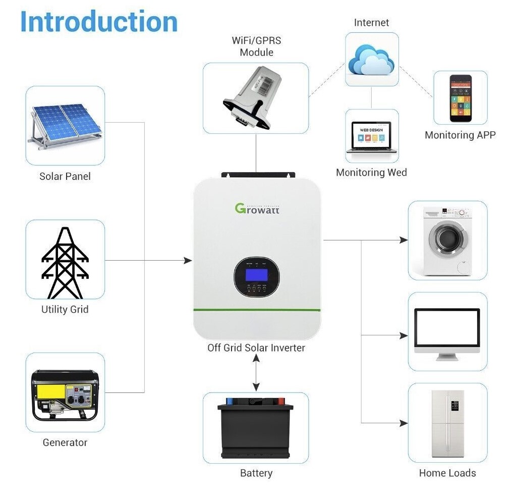 Jedná se o multifunkční solární invertor pro ostrovní provoz, s integrovaným MPPT solárním regulátorem nabíjení, vysokofrekvenčním čistě sinusovým invertorem a funkčním modulem UPS v jednom stroji, který je ideální pro záložní napájení mimo síť a aplikace s vlastní spotřebou.