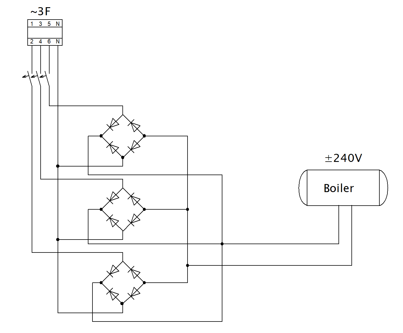 Zdravím, omlouvám se za možná blbou otázku ale chci se vás zeptat zda by bylo možné tímto způsobem usměrnit 3F pro boiler (240V 2KW) abych proud rovnoměrně rozložil. Vlastně jde o to zda můžu takto spojit ty výstupy. Díky