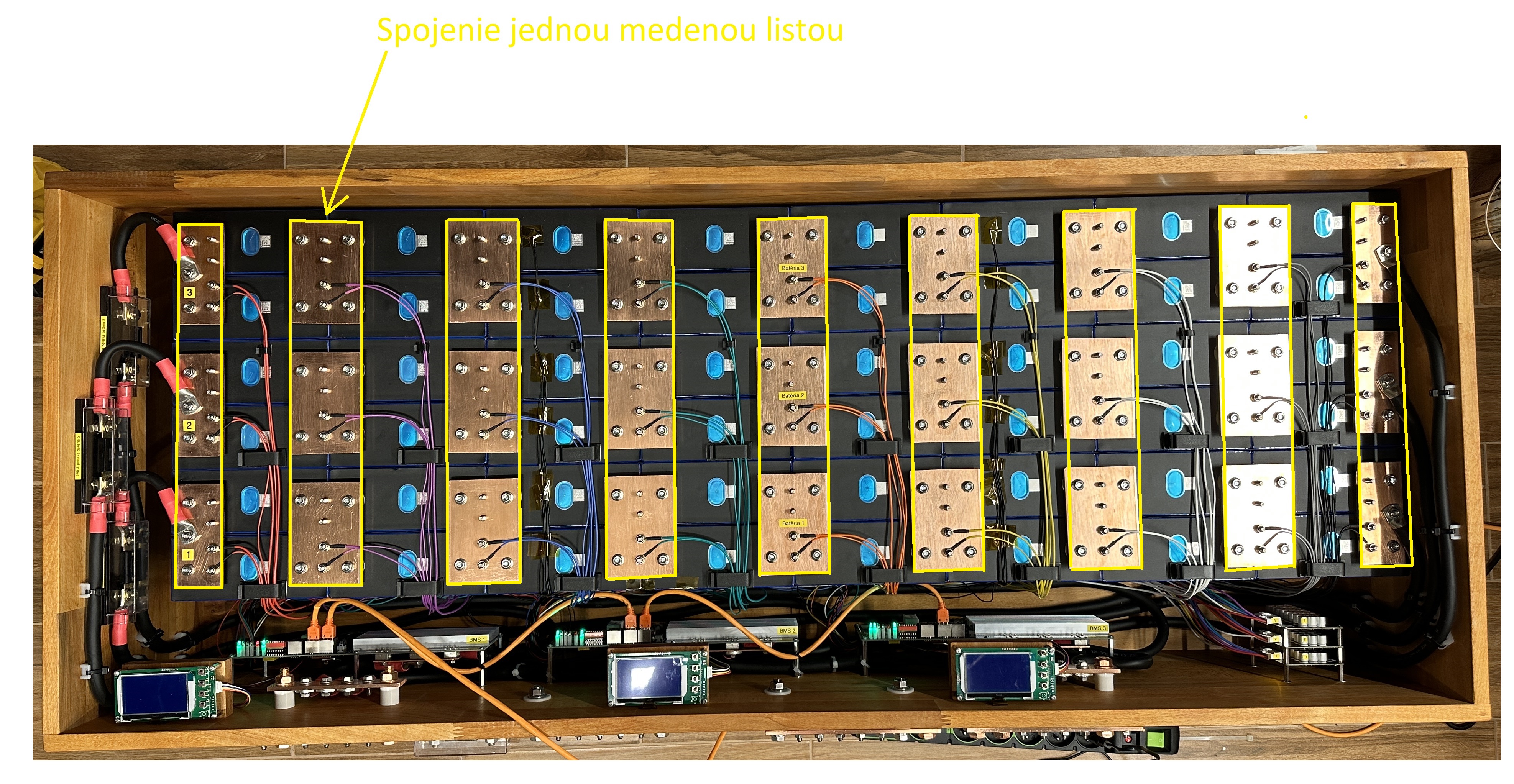 postavil som si LiFePO4 "minibaterku 25.6V 1680 Ah, 43 kWh" z LFP clankov EVE LF280K od Jenny Wu. Je urobena stylom [3P(8S2P)]. Su to v podstate 3 nezavisle 8S2P, kazda s rovnakou BMS Seplos 24V 200A verzia 10D a na vystupe z BMS su paralelne spojene do jednej "minibaterky" Kazda ma aj svoj aktivny kapacitny balancer. Vsetko je vidno na foto. Aktualne bateriu vybijam ale len malym prudom cez umelu 180W zataz. Aktualne mam ale rozdiel 33mV v najhorsom pripade z troch. 3.187 V a 3.154 V.