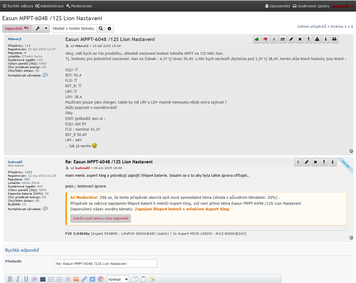 Zde bych bral že se bude probírat jak u koho svítí a podobně. Téma má aktuálně 157 stran a probírají se tam mimo počasí např baterie, ceny panelů atd..