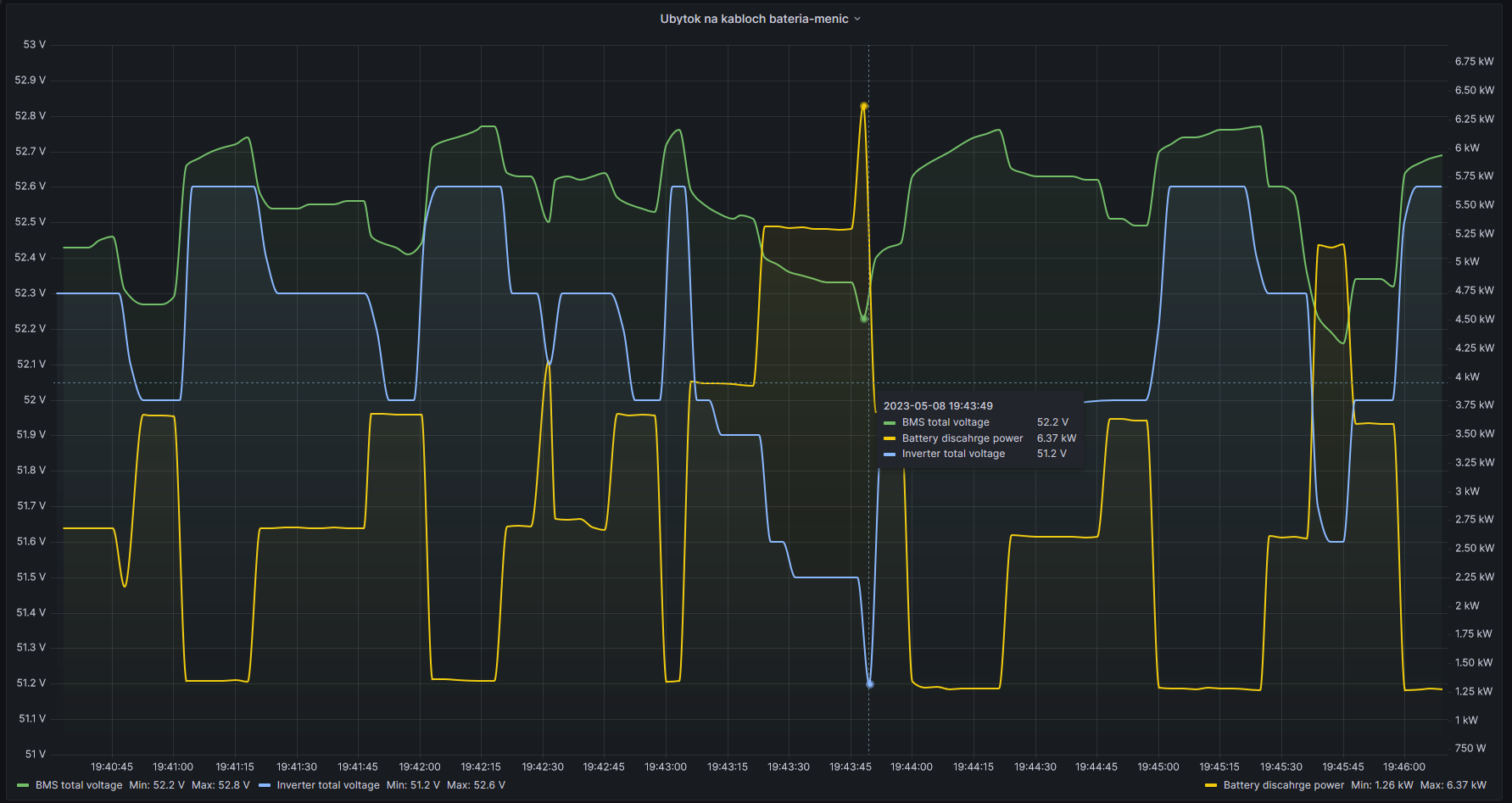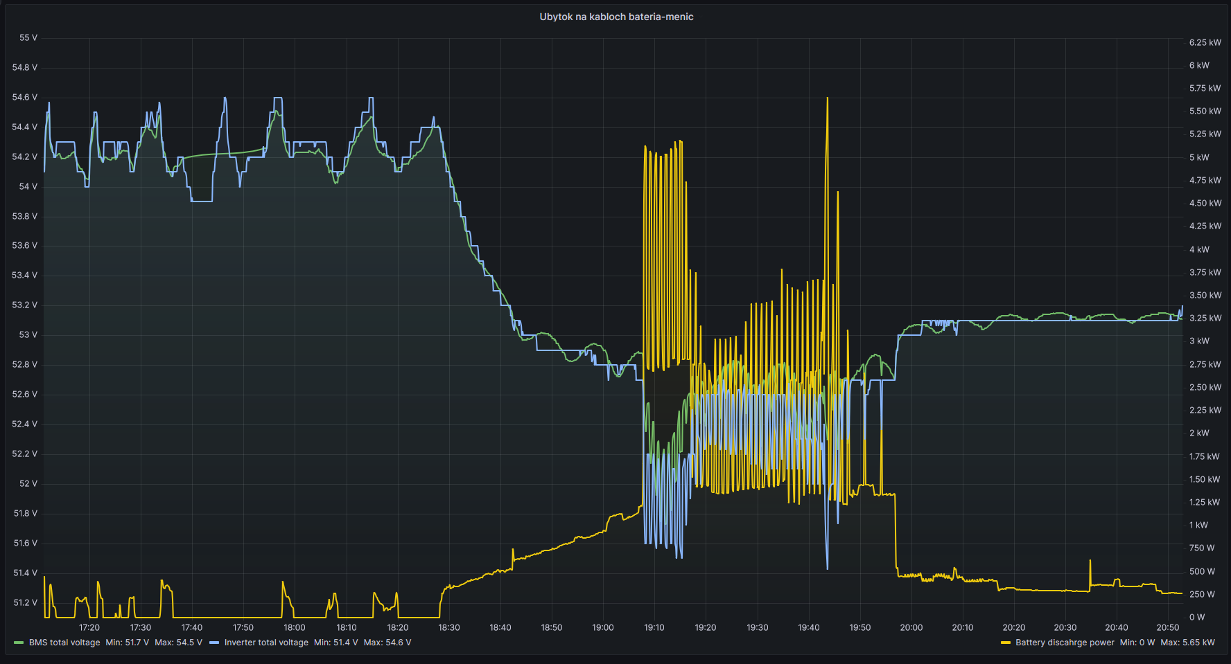 Pri 6.37 kW (120A) z baterky mi to reportovalo úbytok 1V! To som fakt nečakal.