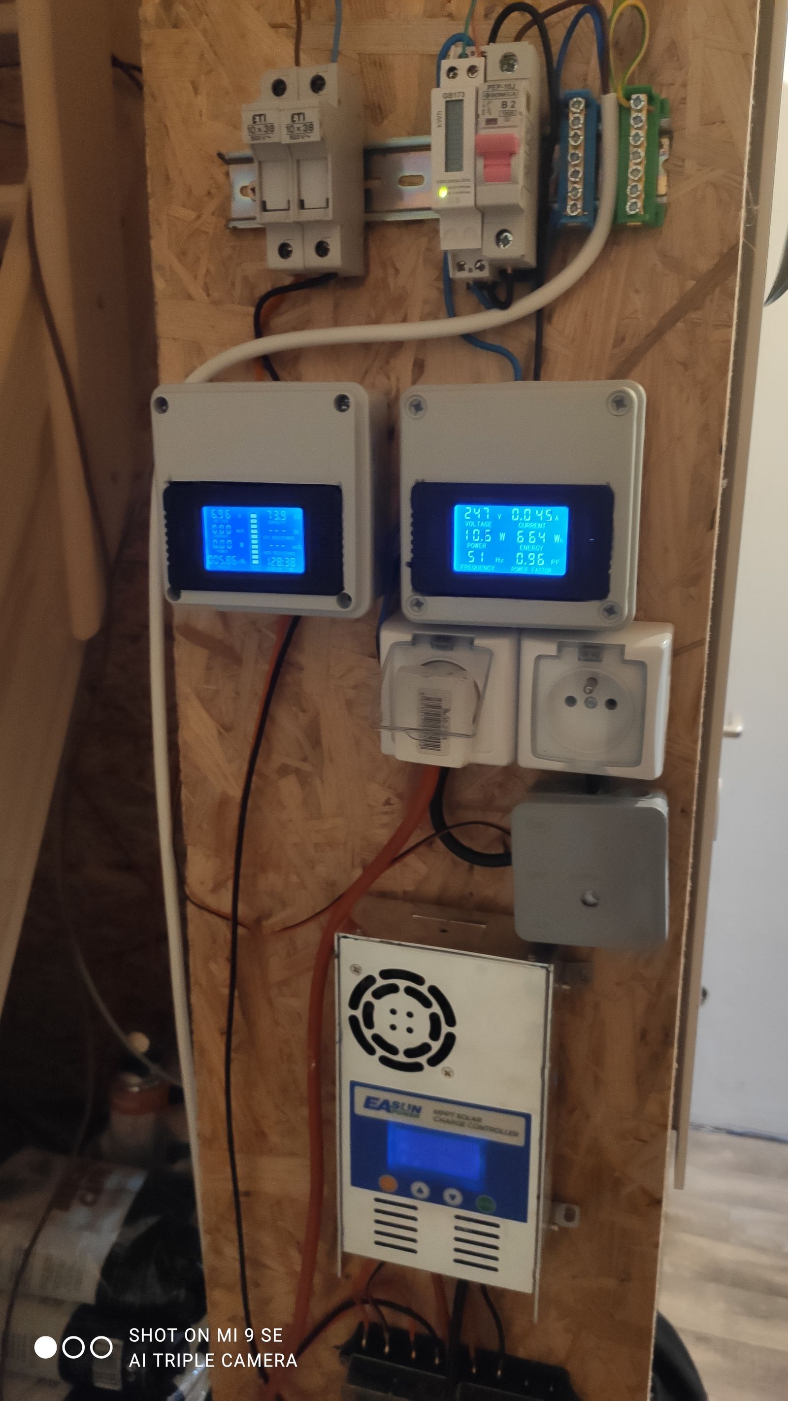 Fáze 0: Tři amorfní panely (360Wp) opřené o hromadu prken a palet, provizorní rozvaděč na OSB desce a na ní prvních pár komponent. A hlavně neskutečná radost z rozsvícení první žárovky