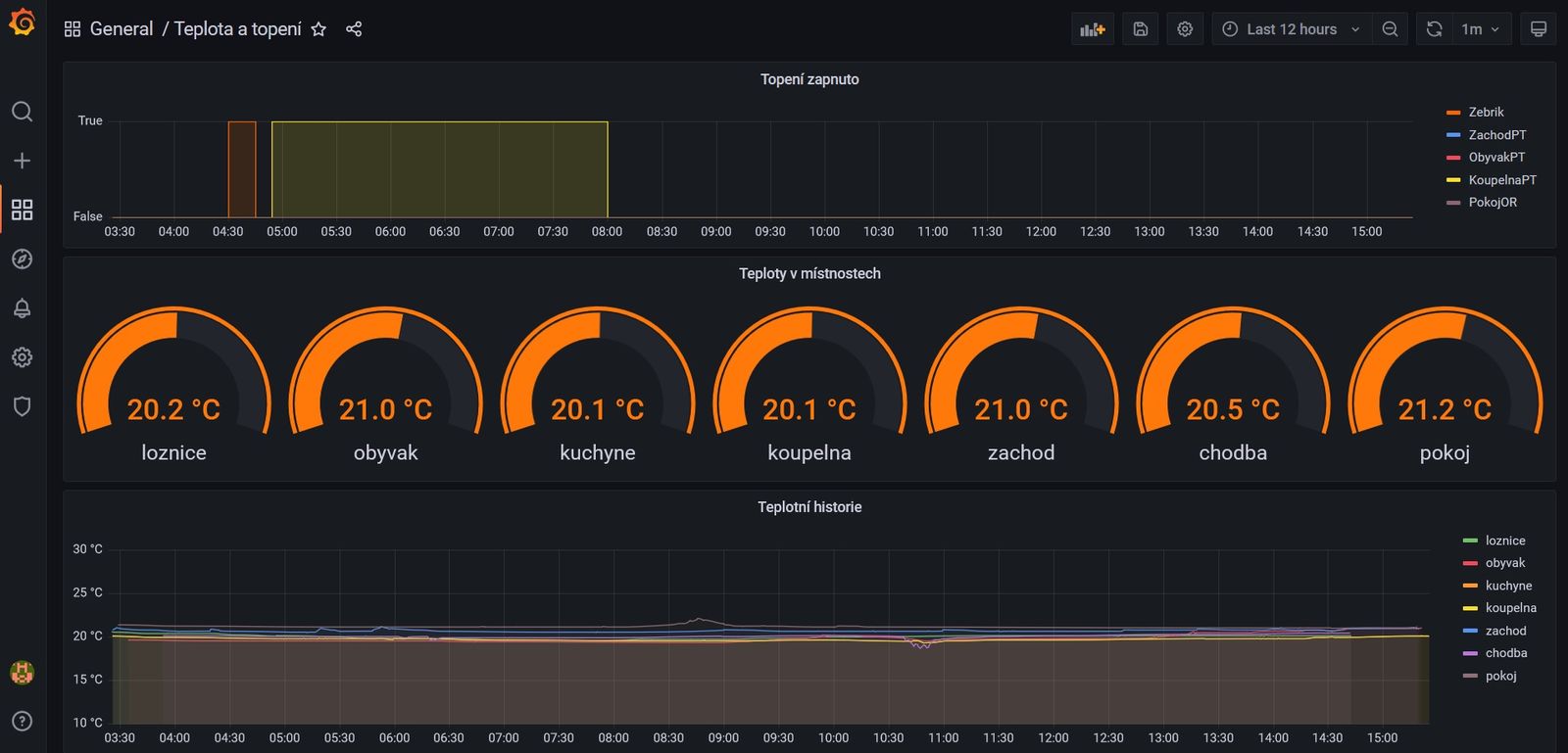 Spodní řada - topení. Většinou topné folie v podlaze, pak topný žebřík v koupelně a nějaký přímotop v podkroví. Řízeno podle teplotních čidel.
