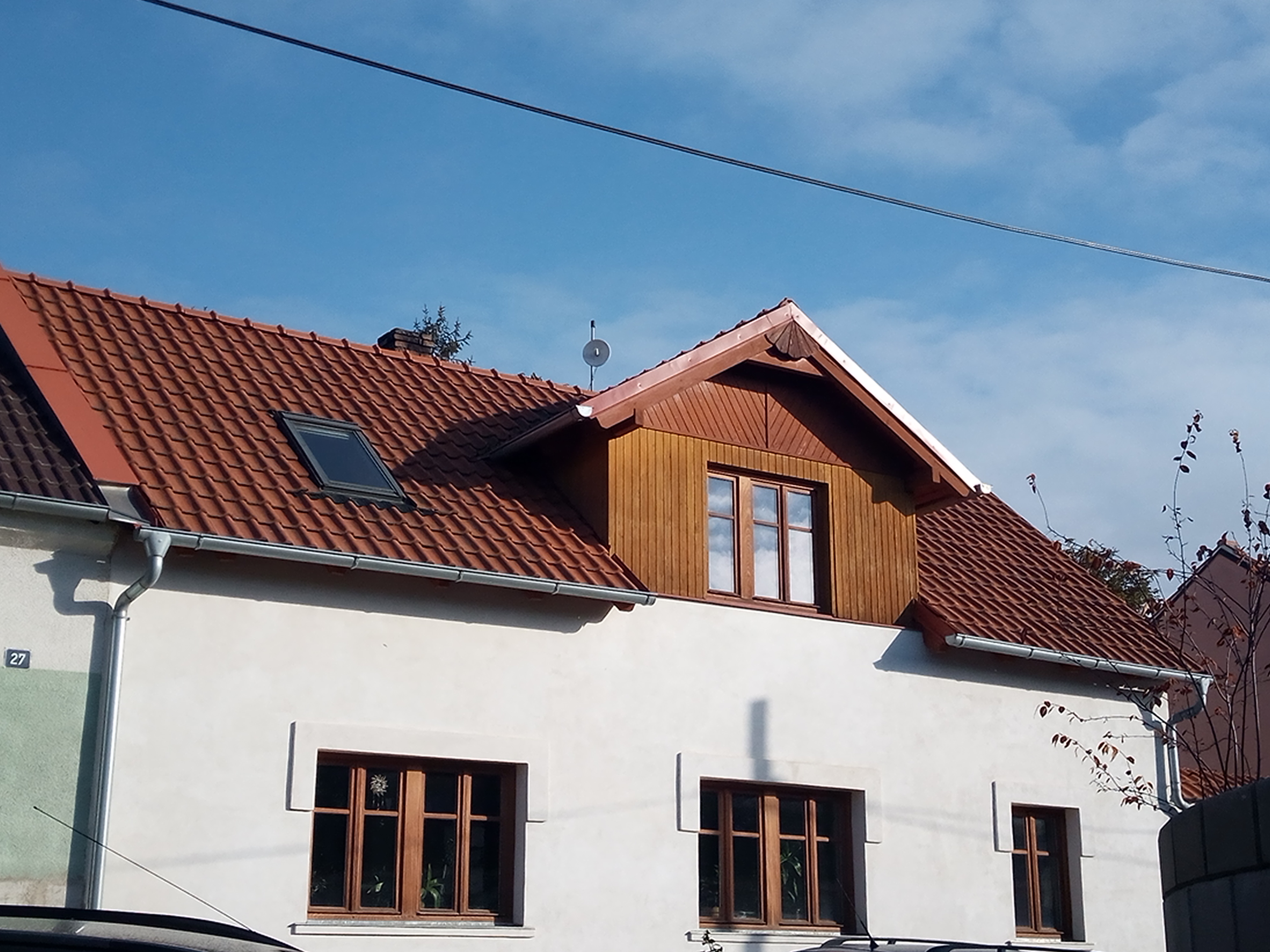 To se zdá, že je tam dost místa. Ty panely mají 175 na 104 cm. Na tuhle levou část se vejdou čtyři, druhá část je ale kratší, ale i tam se vejdou čtyři, tak aby nedocházelo ke stínění vikýřem. To je málo. Ale na stříšku se vejdou dva z každé strany, tři by pochopitelně byl ideál.FRSO píše:Vždy ty 3 panely s sérii by měli být na stejné světové straně, jinak bude velká ztráta dle toho nejméně osvětleného, navic bude mít strink jiné napětí a pak by to asi chtělo oddělit diodou a stringy pojistkami. Máš dost místa na té střeše, dej to co nejvíce nahoru.Martas74 píše:Prosím o radu. Chystám na 48V systém 4 stringy po 3.panelech. Potřebuji vědět zda mohu dát do jednoho stringu dva panely na vikýři plus jeden na střeše. Střecha má ideální jižní orientaci, tzn. stříška vikýře východ a západ. Chápu že dojde k omezení výkonu, ale zajímá mě hlavně zda to nebude problém pro panely. Například v tuto dobu kdy jsem to fotil v říjnu v 10.45 by panely na stříšce vikýře byly zastíněné, kdežto panel na střeše už osvětlen celý, i když pod úhlem. Chápu dobře, že by prostě string nešel do té doby, dokud by slunce neosvítilo ty dva panely, ale jinak by se nic nestalo?