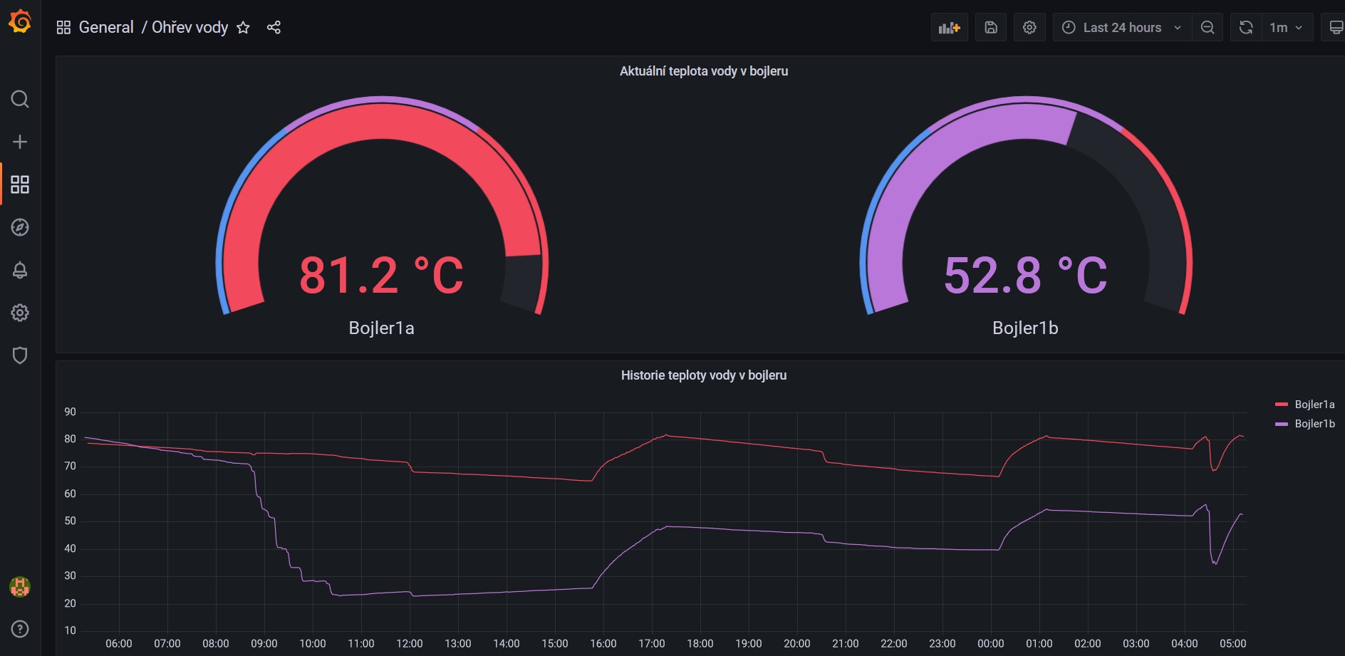 Již před časem jsem k původním tepelným čidlům namontoval další dvě čidla (PT100 v mikro provední) abych mohl sledovat, jak se vlastně ten "inteligentní" bojler chová. A je to asi takhle: Bojler změří teplotu a pokud je nižší než nastavená, tak nahřeje na požadovanou teplotu nejdříve výstupní nádrž a pak přepne na vstupní nádrrž a nahřeje i tuhle. Max příkon je tak k pořád jen 1,5kW. Pak odpočívá a pokud v některé nádrží klesne teplota o více než 5 stupňů nahřeje ji. Zas tak moc inteligence v tom nevidím