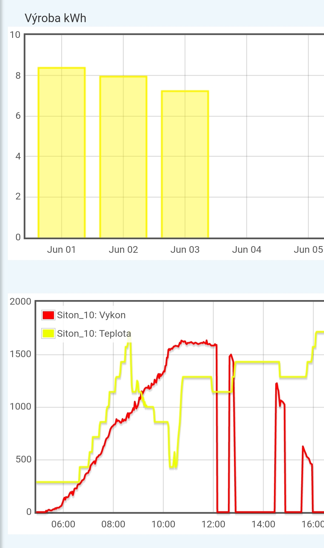 v aprili, ked boli studene davali 2,1kWp, teraz ked su horuce, tak sa splhaju max na 1,7kWp (su to jazdenky).