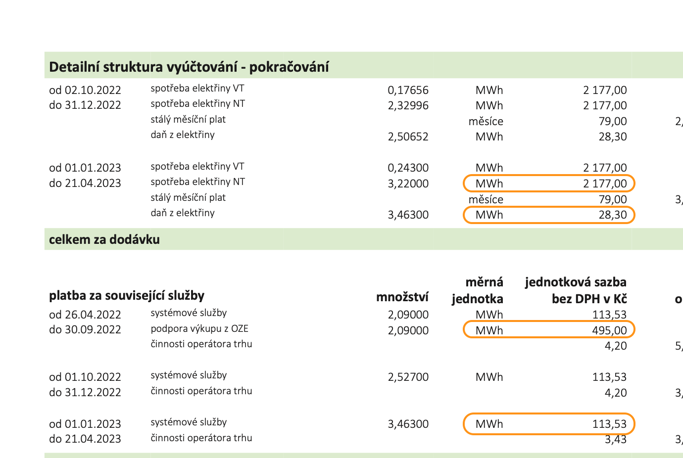 Dekuji za odpoved. Usporu pocitam pouze z ceny za dodavku elektriny, protoze predpokladam ze pouze to mi FVE usetri. V priloze jsou cerveně polozky za rok 2022, ktere do usetrenych penez za MWh zahrnuji. Za rok 2023 jsou cisla stejna az na drobnou slevu - "spotřeba elektřiny VT a NT" je za 2177Kc/MWh. Pokud je tedy muj vypocet spravny, tak mam (zatim) pomerne dobrou cenu elektriny a tim padem horsi navratnost FVE.