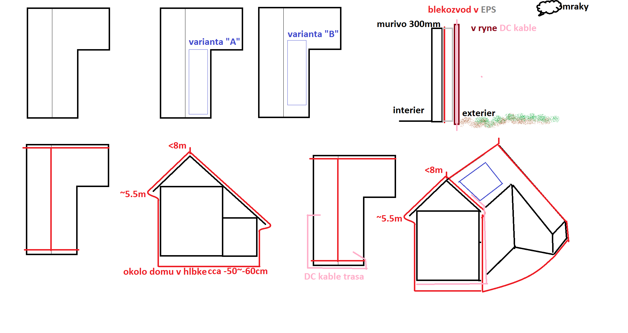 Bleskozvod ide v chranicke (sedej farby) priamo medzi porobetonovym murivom a priamo v zatepleni z EPS. "aby nebol vidiet". Potom je cca 2cm medzera, a je tam zvod dazdovej vody. A tam planujem natiahnut DC kable, kazdy vo svojej chranicke (ciernej farby vlastnosti FXP), tieto kable by som nasledne tahal pod chodnikom (betonova dlazba), hlbku viem prisposobit, a potom zase prevrtat EPS+murivo a dostat ich do technickej.