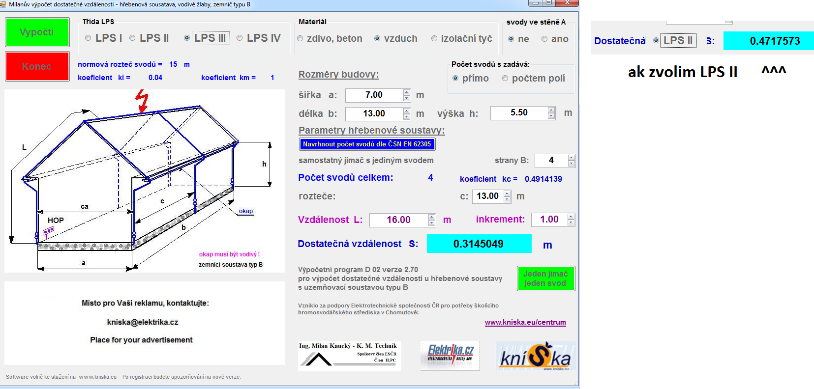 Ak zvolim LPSI alebo LPSII program automaticky odporuci az 6 zvodov, ja ich mam 4. pri LPS III odporuci 2 zvody. Ale ak som dobre pocital, mal by som mat "s" medzi 31 az 47cm... v najvyssom "l=16m" bode.