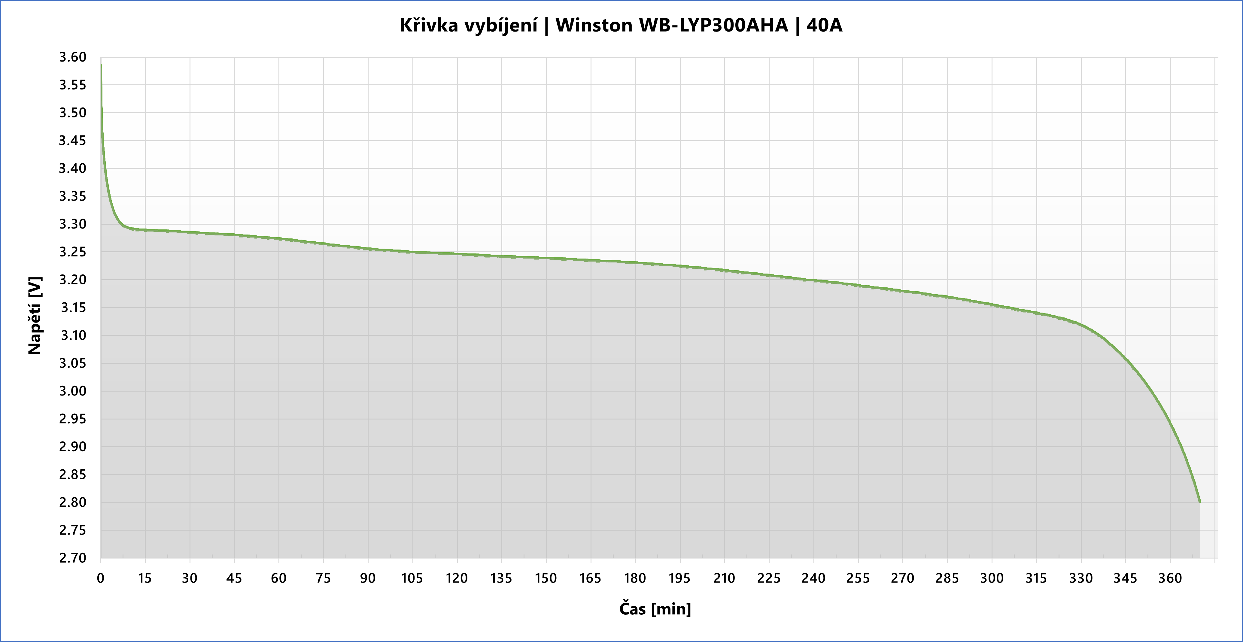 Prodám LiFeYPO4 články Winston WB-LYP300AHA. K dispozici zatím 40ks. Pocházejí z dopravního prostředku. Průměrná kapacita 244Ah, tj. 0.78kWh. Každý článek byl otestován vybíjecím proudem 40A, vybíjecí křivka níže. AC vnitřní odpor 0.4mΩ. Vnitřní závit kontaktů je M12. Technická dokumentace v příloze.