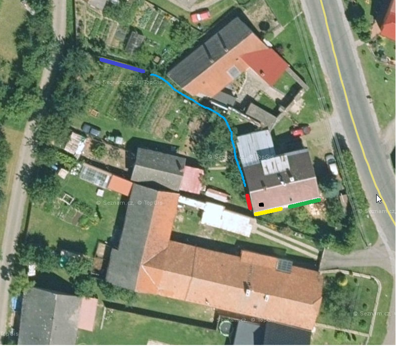 Každopádně, mezi listopadem a únorem je slunce tak nízko, že je výkon obou regulátoru na hraně. Proto bychom rádi přidali třetí regulátor. Ten by měl osazené panely na tmavě modré linii, kvůli dobrým světelným podmínkám v zimě. Světle modrá čáry značí vedení kabeláže.