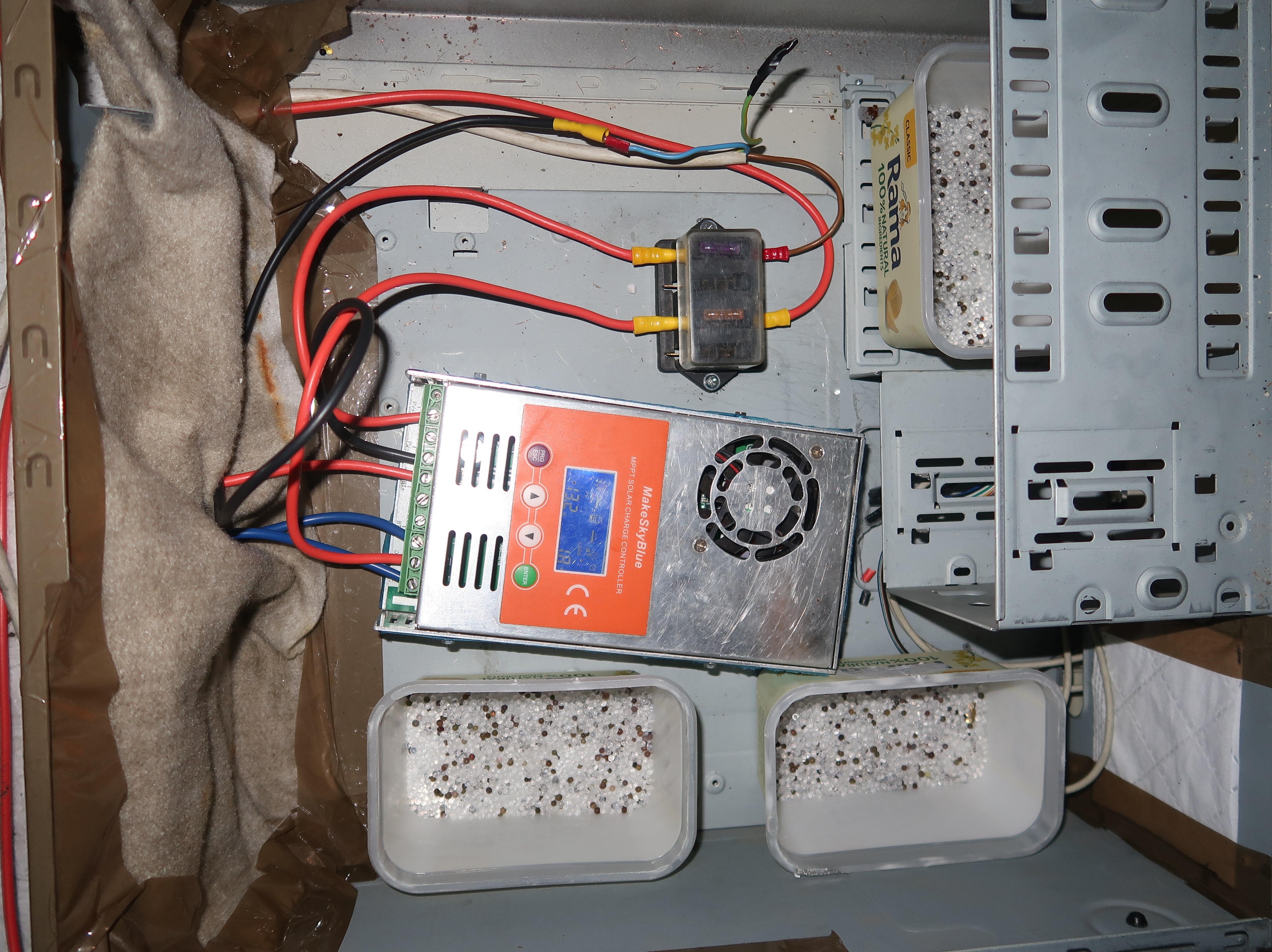 Baterii už jsem nechtěl mít v obytné místnosti, přemístil jsem ji tedy do sklepa. Regulátor i s pojistkami jsem vzhledem k vysoké vlhkosti ve sklepě, která dosahuje 90-95 %, raději umístil do staré PC skříně, tu utěsnil a dovnitř dal krabičky se silikagelem.