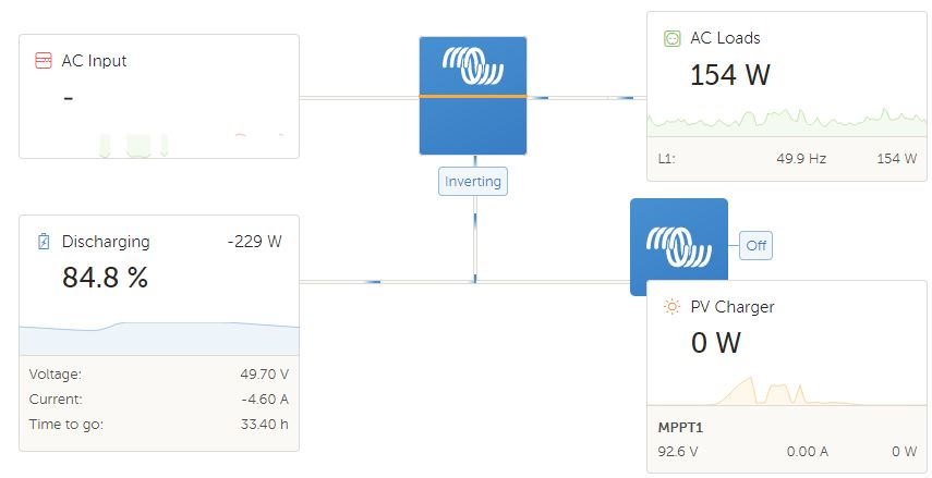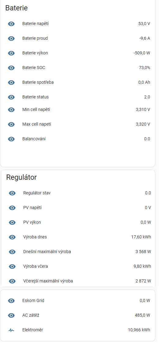 Muzes si dat na dashboard tohlebereda20 píše:Ideálně všeho a i klidně něco navícAntrac1t píše:realny data ceho? menice,regulatoru ci baterie?Data mám všechny co potřebuji přes modbus, victron sám o sobě u ničeho neměří kWh, vše je v reálných hodnotách, takže jsem na potřebné senzory umístil v HA integrátory a zobrazuji ty. Výsledek vypadá nějak takto Vypadá to sice hezky, ale reálně mi to neřekne na kolik je nabitá baterie, nebo jaká je spotřeba na měniči, zda ještě mohu něco zapnout. Zatím to řeším touhle hezkou vizualizací a podtím tabulkou s hodnotami, kdyby šla zobrazit jiná vizualizace kde bude real-time měření, vůbec by to nebylo špatný. Victron to má třeba takto