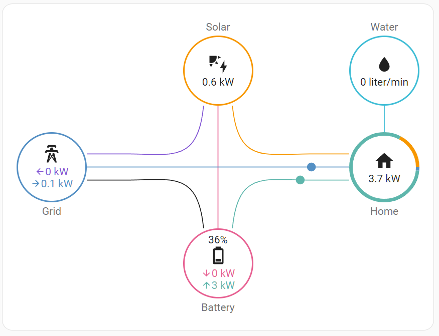 Ty Power flow card naopak nabízejí stejnou vizualizaci s aktuálním stavem s tím, že si tam můžu do jednotlivých kategorií sám nastavit jaké hodnoty sleduje, rychlost vizualizace (rychlost kuliček podle velikosti zabrazených hodnot), mění se tok energií podle aktuálního stavu, může se měnit barva ikony Domov nebo Baterie podle toho, jakou energií je napájená (solární, baterie, síť a podobně), ukazuje stav nabití baterie a kolik energie do baterie jde nebo se naopak odebírá a podobně. Samozřejmě umí to samé u vody, plynu a podobně. Prostě se člověk koukne na jeden obrázek a má hned přehled o tom, co se teď v systému děje jako to má třeba ten Victron (akorát to vypadá jinak).