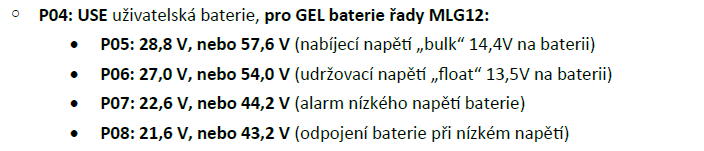 V návodu k REVO měniči se uvádí, že baterie řady MLG12 (datasheet v příloze) je možno vybít do 10,8V (10,8 x 4 = 43,2). Kontroloval jsem s podporou Vselektro a potvrdili mi to. Jedná se o trakční baterii, která má být odolnější vůči hlubším vybitím.