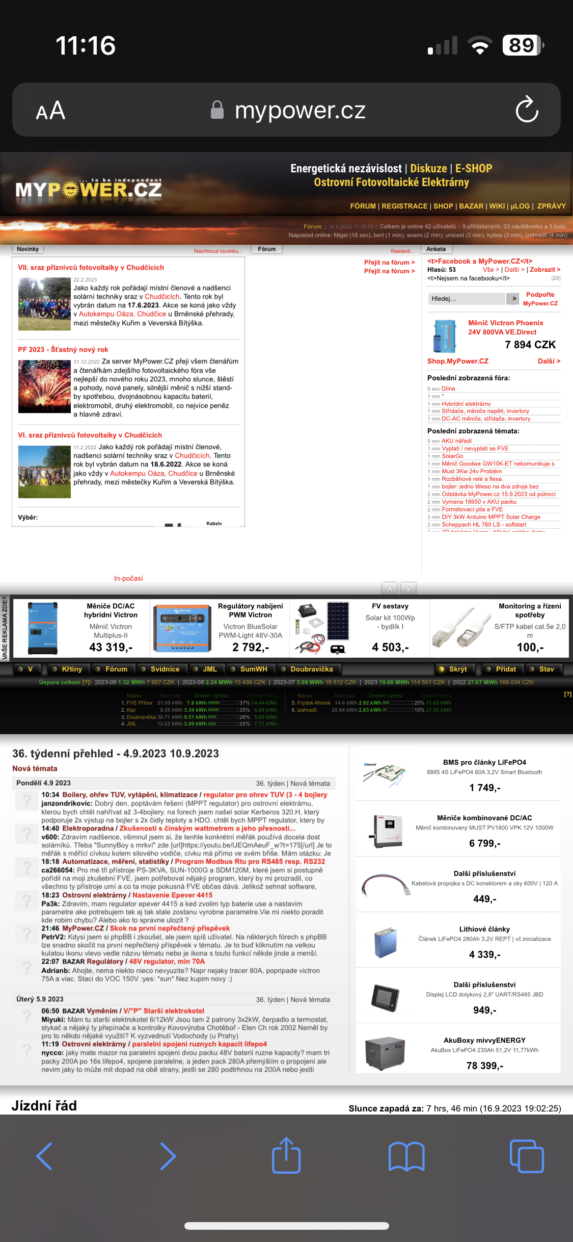2x MUST PH1800 5.5kW, 9kWp V+J+Z, 600 Ah LiFePO4 s BMS JBD 200A, SW: Home Assistant na Synology DS923+ ku tomu ESPHome, Tasmota, MariaDB, InfluxDB, Telegraf, Grafana, Zigbee2MQTT..., HW: ESPlan (ESP32 + LAN 8720 + RS485). Nejaké moje projekty: MUST-ESPhome, ELTEK Flatpack2 ESPhome, ESP32-EMON, PZEM-017@WiFi, diyBMS-CurrentShunt-ESPhome , BMS UART-TS485 adaptér