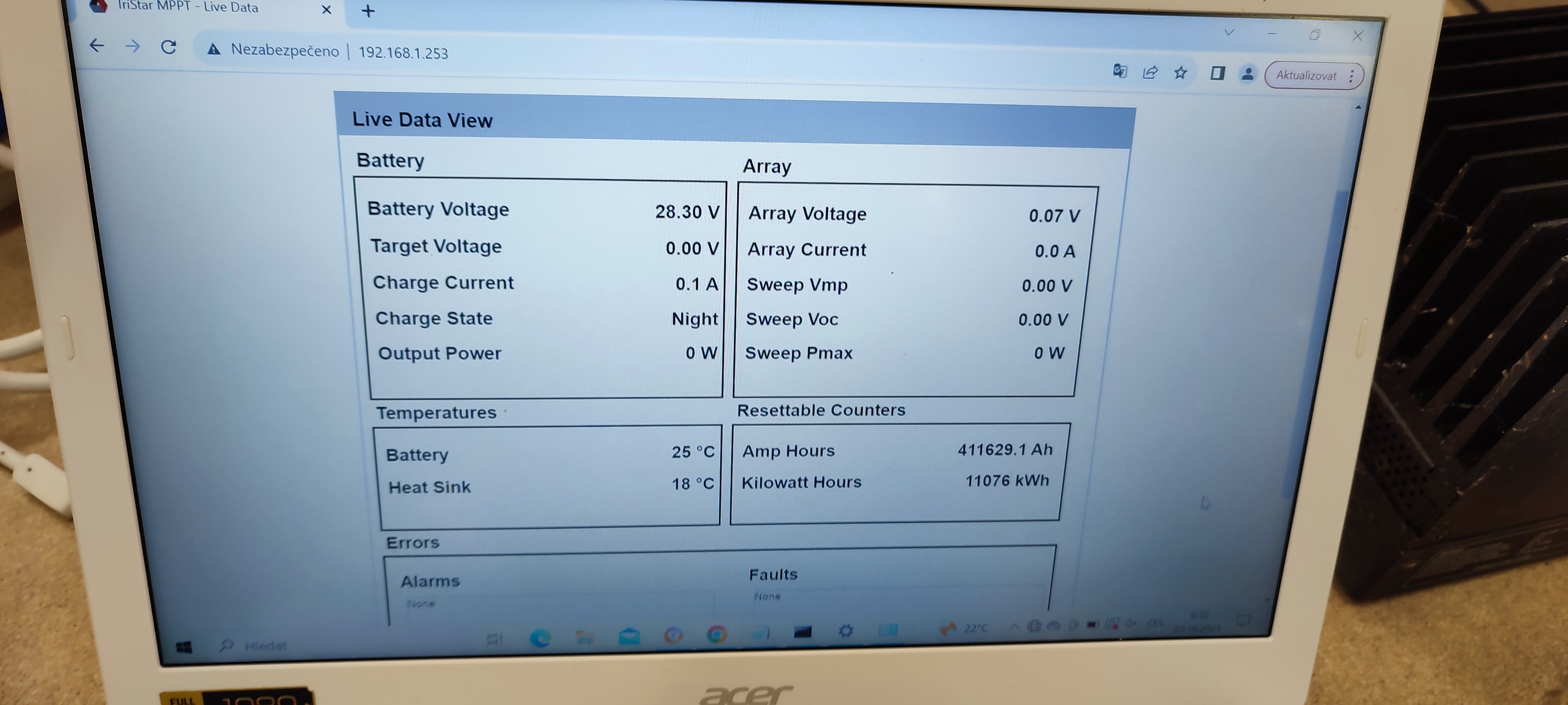 15 kWp JJZ + 3x Tristar MPPT60 + Victron 150/100 + 48V LiFePO 850 Ah + UPS 8kW (MPP-Solar 8048 LC) + 4 x nabíječka 1,2 kW (DELTA) Start: 2012