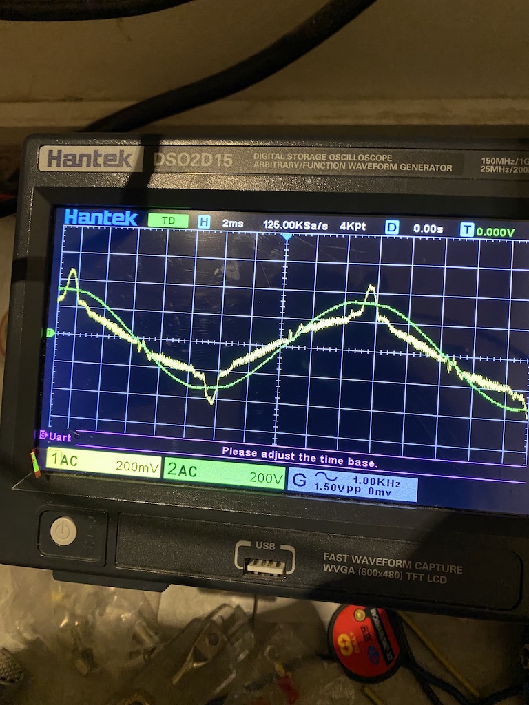 A takhle nějak to vypadá, když krmím ze střídače klimatizaci. Mimochodem sinusovka z Axperta sice není dokonalá, ale vypadá rozhodně líp, než sinusovka ze sítě, ale o tom zase někdy jindy.