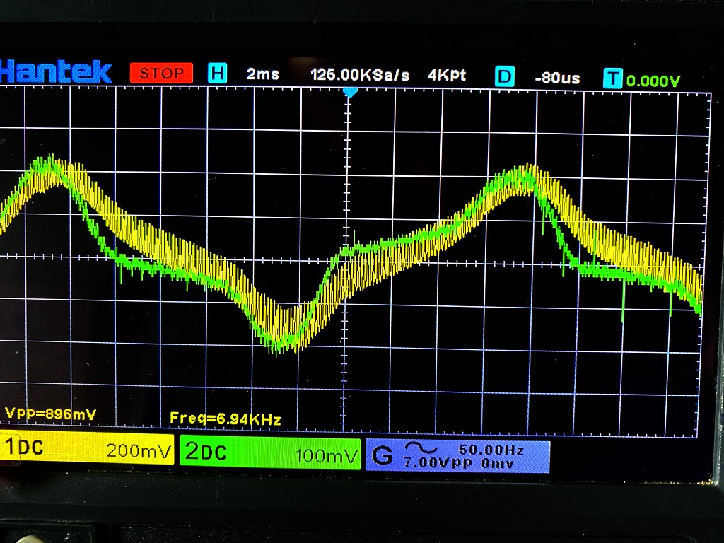 Proudový transformátor BZCT30AL ve verzi 50/5A oproti sondě Hantek CC-65 při střídavé zátěži převážně indukčního charakteru (ruční pásová bruska, první věc, co mi přišla pod ruku). BZCT30AL přes 10x sondu zeleně, Hantek žlutě. Bylo by hezké u toho vidět i síťové napětí, ale čtyřkanálový osciloskop tu jaksi nemám.