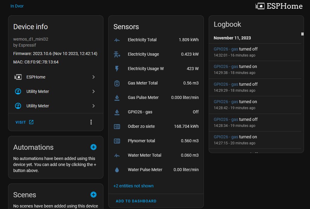 Je to zapojené na jedno ESP32 s ESPhome firmware, a meria spotrebu vody, elektriny a už aj plynu. YAML hodím aj na github, keď dokončím dokumentáciu. Zatiaľ aspoň kúsok kódu: