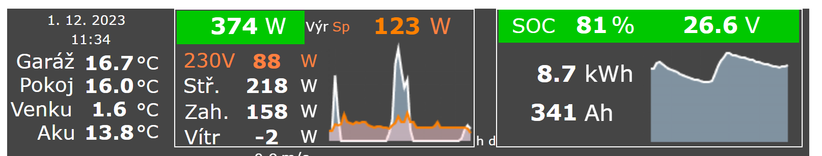 FYI. Aktuální stav poustevny i se zapojeným mražákem, který je zrovna sepnutý. Ale sněží a bude sněžit, tak lze dobře čekat, jak na tom bude střecha ("Stř.") už odpoledne. Zato nový plůtek na zahradě ("Zah."), se snaží, ať sněží či nesněží. Sníh na panelech je pro ostrov největší nepřítel.