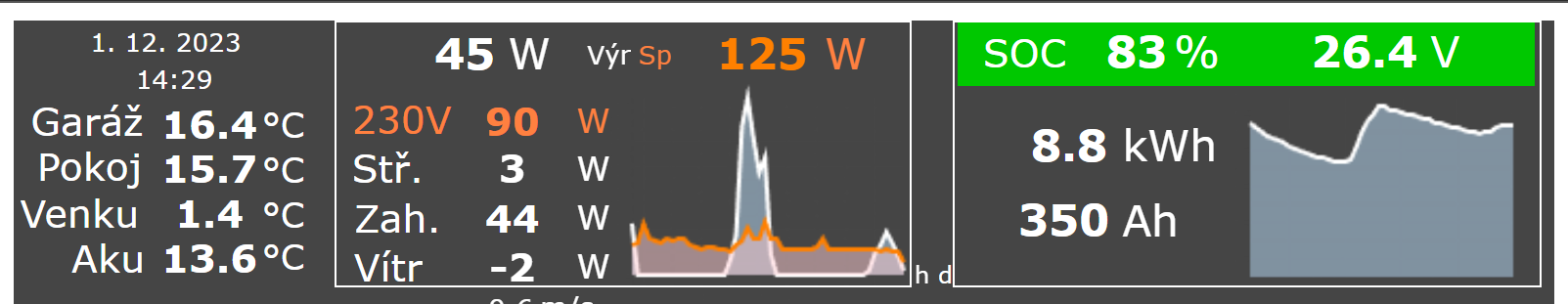 - Je třeba ukrutně minimalizovat klidovou spotřebu, v zimě se počítá na ostrovu doslova každý watt. Kvůli minimalizaci vlastní spotřeby měniče jsem šel do Victronu z původních Axpertů (oba Axperty, které tam stále mám, jsou nyní standardně vypnuté, jeden nyní funguje pro dobíjení, druhý je zatím zvlášť pro nabíjení auta, ale asi půjde pryč). U mne dále běží modem/router a PLC/elektronika. A právě nyní zkouším, zda to celé (mám ten nový plot) utáhne malý mrazák, který značně zvyšuje komfort, když do poustevny přijedu