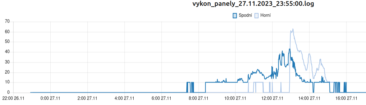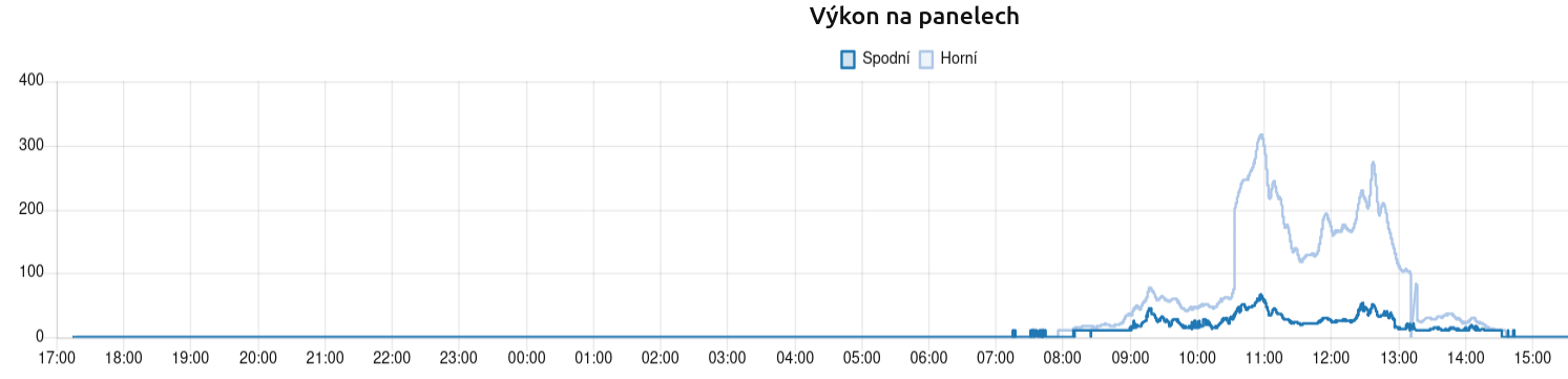 Horní panely je string o výkonu 2kW spodní má výkon 1,6kW.