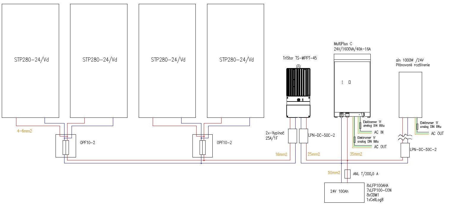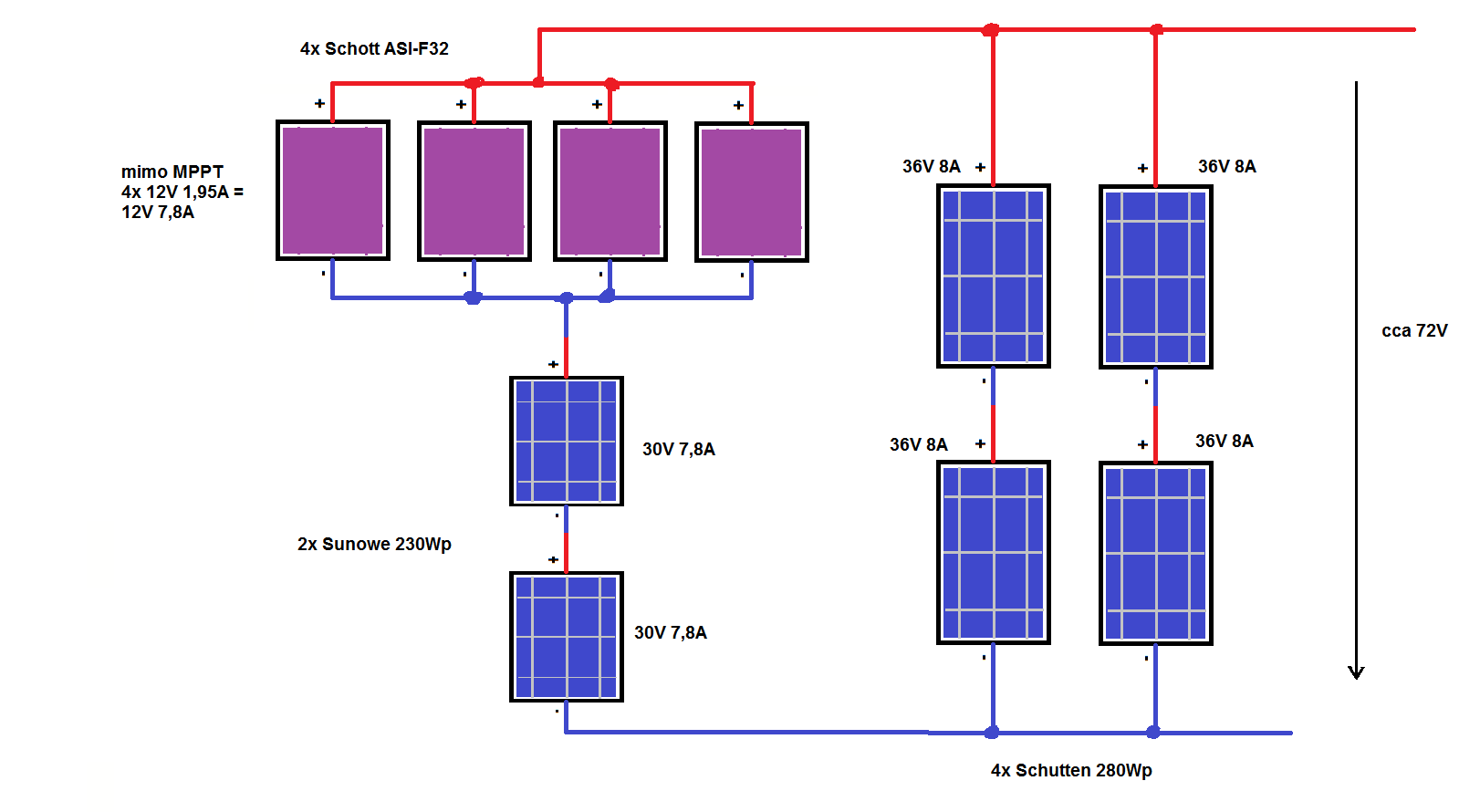 Tady je na první pohled vcelku podivné zapojení, ale je to asi maximum co lze udělat. Amorfy a Sunowe krystaly by byly pověšeny na balkoně JZ, schutteny 280W máš na přístřešku JV. Amorfy by pak pracovaly asi 5V mimo bod maximálního výkonu a 280W schutteny o 2V mimo. Dohromady by to pak mohlo vcelku obstojně fungovat. Jen by šlo využít maximálně nějakých 1200W místo 1700W, vzhledem k malé baterii by to ale zas tak moc nevadilo.
