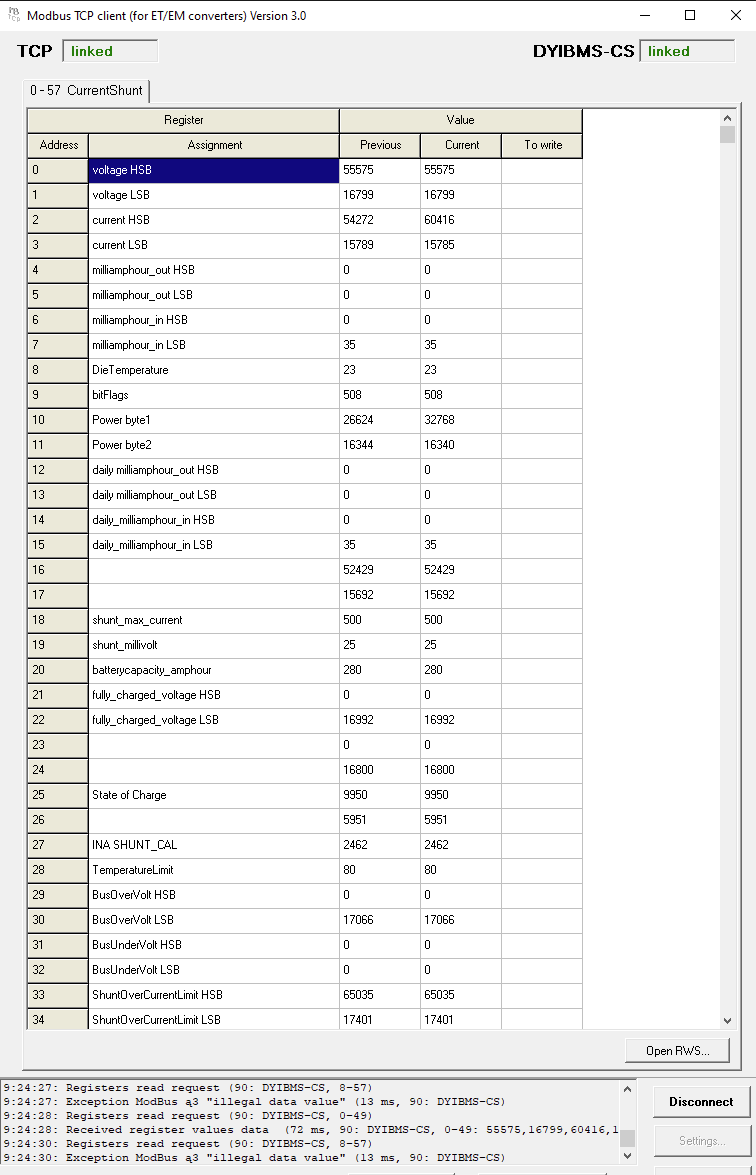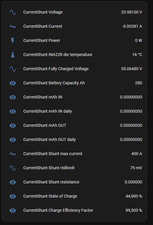 Tak kodl69 mi to nakoniec poslal domov na oživenie, stálo ma to jednu prebdenú noc. Registre na githube patria pre samotnú diyBMS a nie pre CurrentShunt! Modbus registre pre CurrentShunt sú 0-57, device ID = 90, parametre RS485 19200/8N1. Pekne mi to číta cez TCP modbus, ale v HA alebo na ESPhome treba ešte urobiť kalkulácie tých double hodnôt.