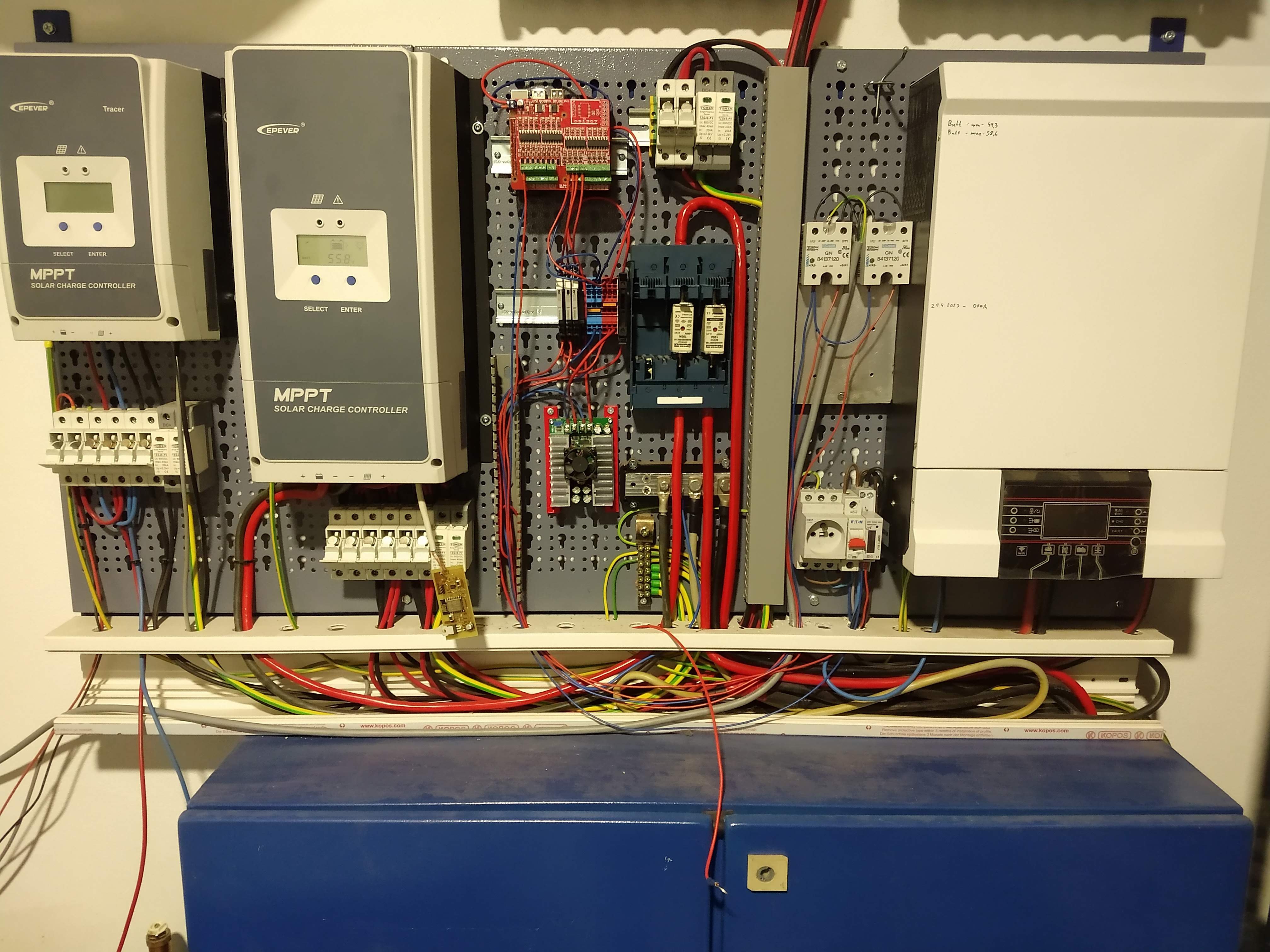Kompletně zapojeno, EPevery už nabíjí, střídače běží, i když zatím v "ručním režimu".
