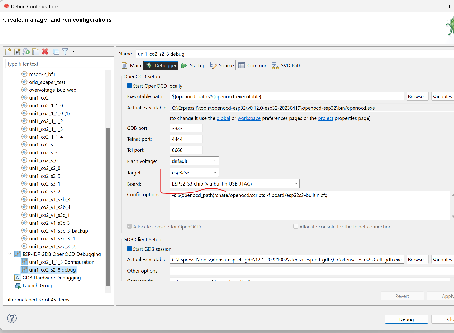 Pokud používáš S3 (nebo jiné s JTAG jako C3), tak s ESP-IDF, které používám, je ladění "zadarmo", USB D- a D+ přímo na GPIO 19 a 20 (zvládají btw 5V, dokonce jsem od Espressif lidí viděl v diskuzi doporučení "když to nefunguje, odstraňte všechny přepěťové ochrany atd. z D+ D- pinů). V debug konfiguraci ESP-IDF pak stačí přestavit jediný parametr, viz obr. Tento přímočarý způsob ladění je jednou z výhod ESP32.kamils píše: ned pro 31, 2023 11:48 amJestli se mohu zeptat na to ladění ESP32-S3.