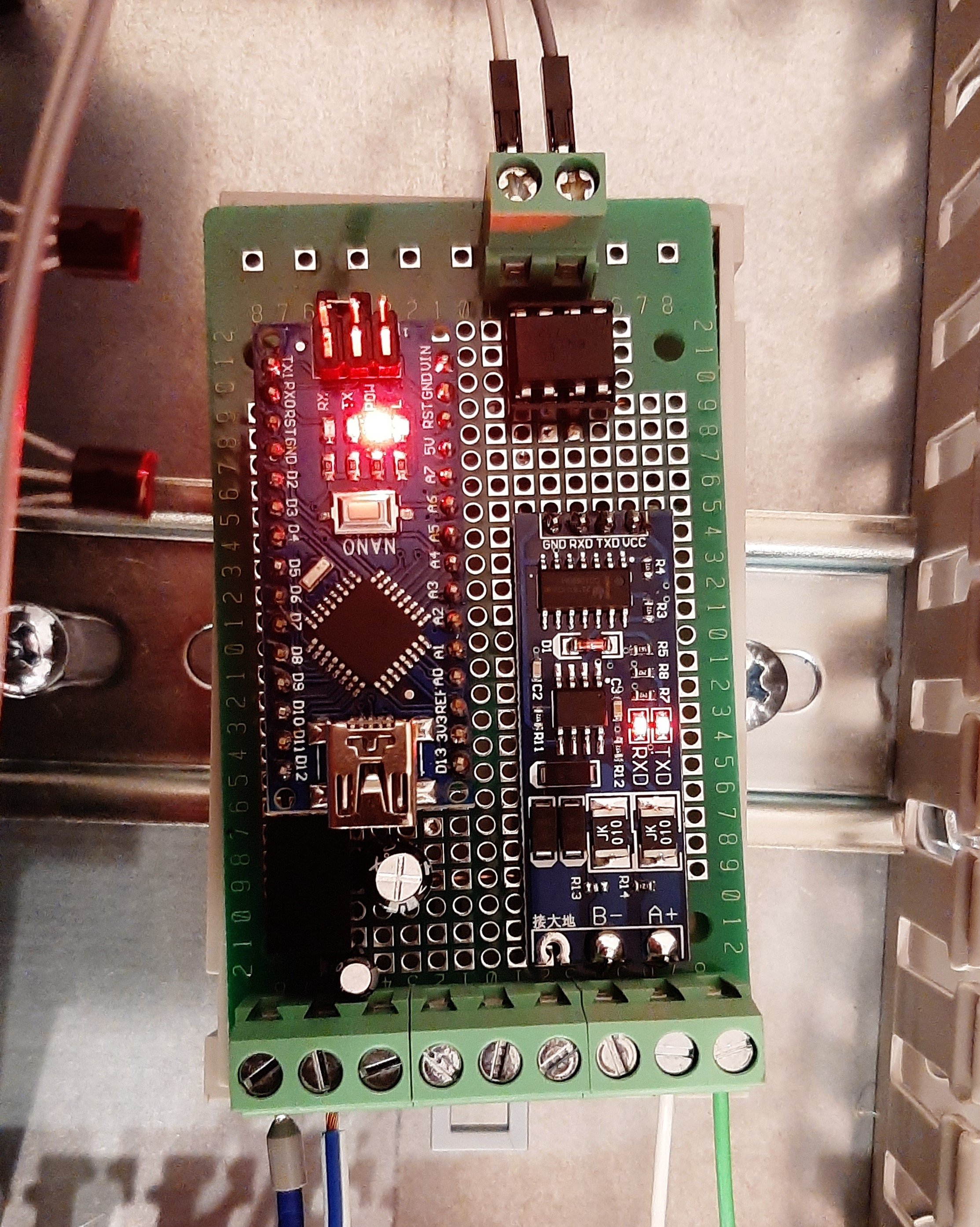 Hlavní součástí převodníku je Arduino Nano, modul UART na RS485, optočlen 6N137, DC/DC na 5V a pár kondenzátorů.