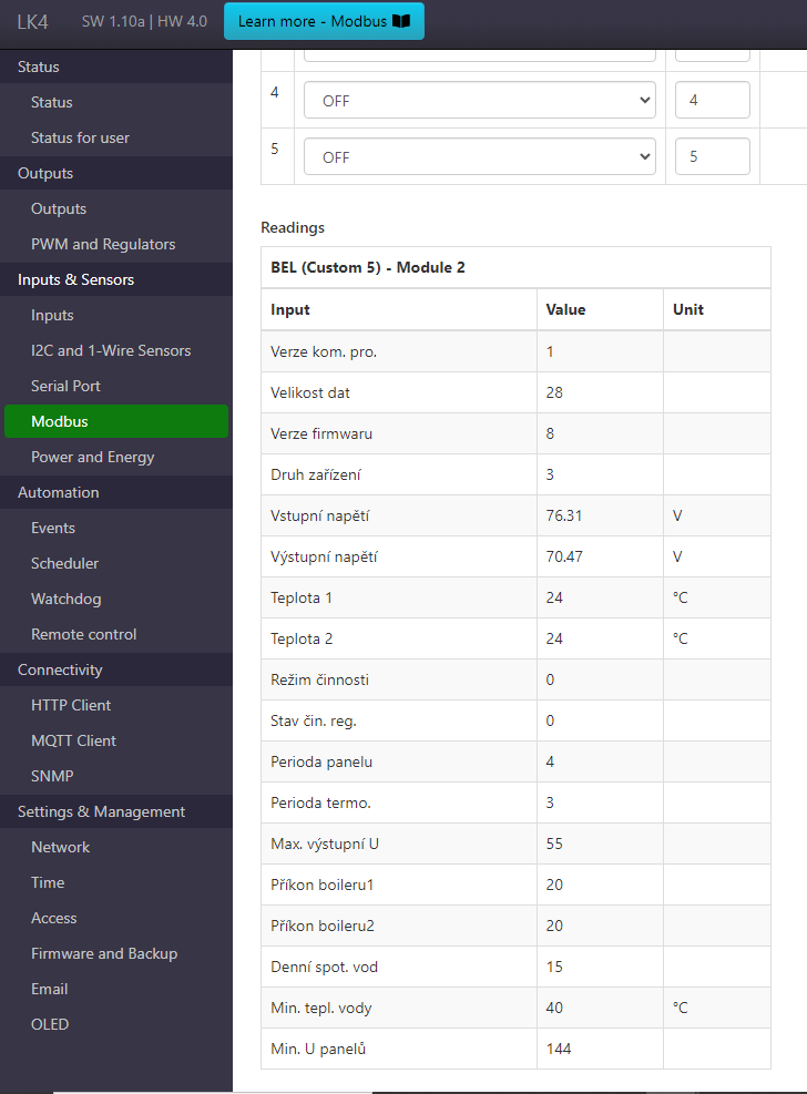 Autor popisuje konstrukci modulu pro vyčítání dat z BEL regulátoru MR4316AC NG pomocí Arduino Nano a RS485 ModbusRTU. Modul využívá UART rozhraní BELu, optočlen a převodník UART na RS485 pro přenos dat rychlostí 9600 Bd. Data jsou odesílána každou sekundu a vyčítána do zařízení Siemens Logo s plánovanou podporou MQTT. Projekt je určen pro lepší monitoring a řízení regulátoru s možností dalšího rozšíření a optimalizace kódu.