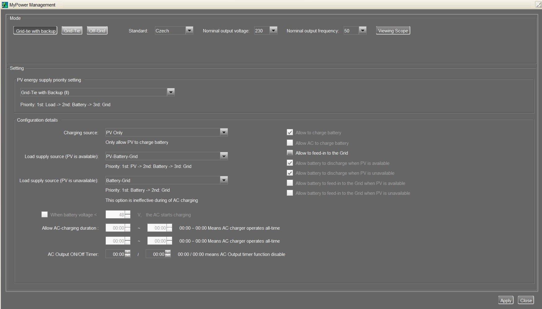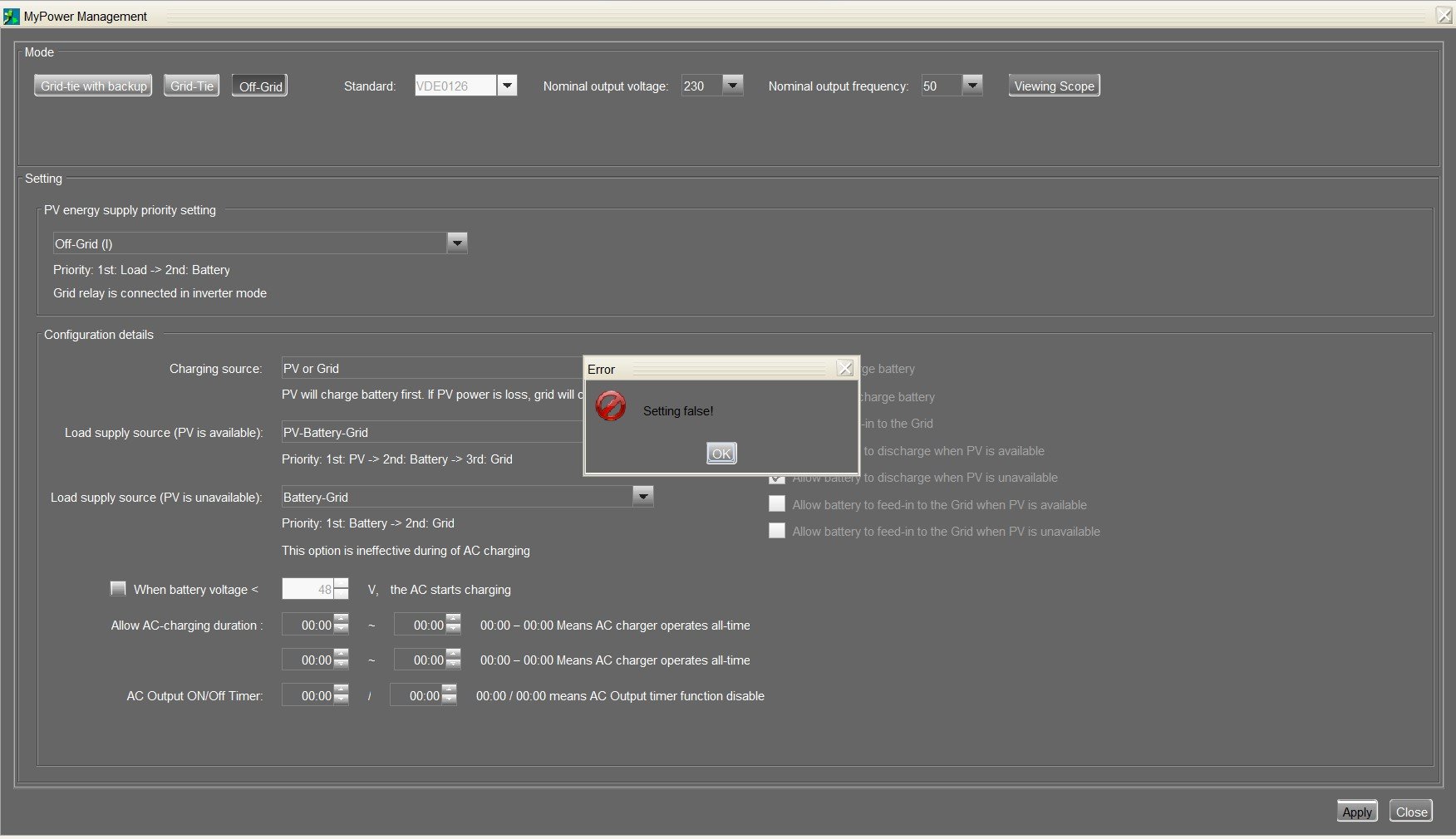 Zdravim. Uz asi 2 mesiace sa snazim vyriesit problem s InfiniSolar 10kW menicom. Pri pokuse zmenit nastavenie menica na Off-Grid alebo ine ako Grid-Tie with Buck up (II) konci hasenim Setting False. Uz som skusal asi vsetko co sa da. S pripojenim na ele. siet aj bez siete, s vyputym "AC out", iba s bateriami a neviem co este. Riesil som to aj s dovozcom ale ani im sa nepodarilo prist na to co to sposobuje. Ich zaver bol, ze aby som skusil RS 232 spojenie s PC, ze USB moze byt problemove. Co sa mi zda nelogicke lebo z tovarenskeho nastavenia to islo zmenit na Grid-Tie with Buck up (II). Stretol sa uz niekto s takymto porobelemom? Nejake napady ako na to?