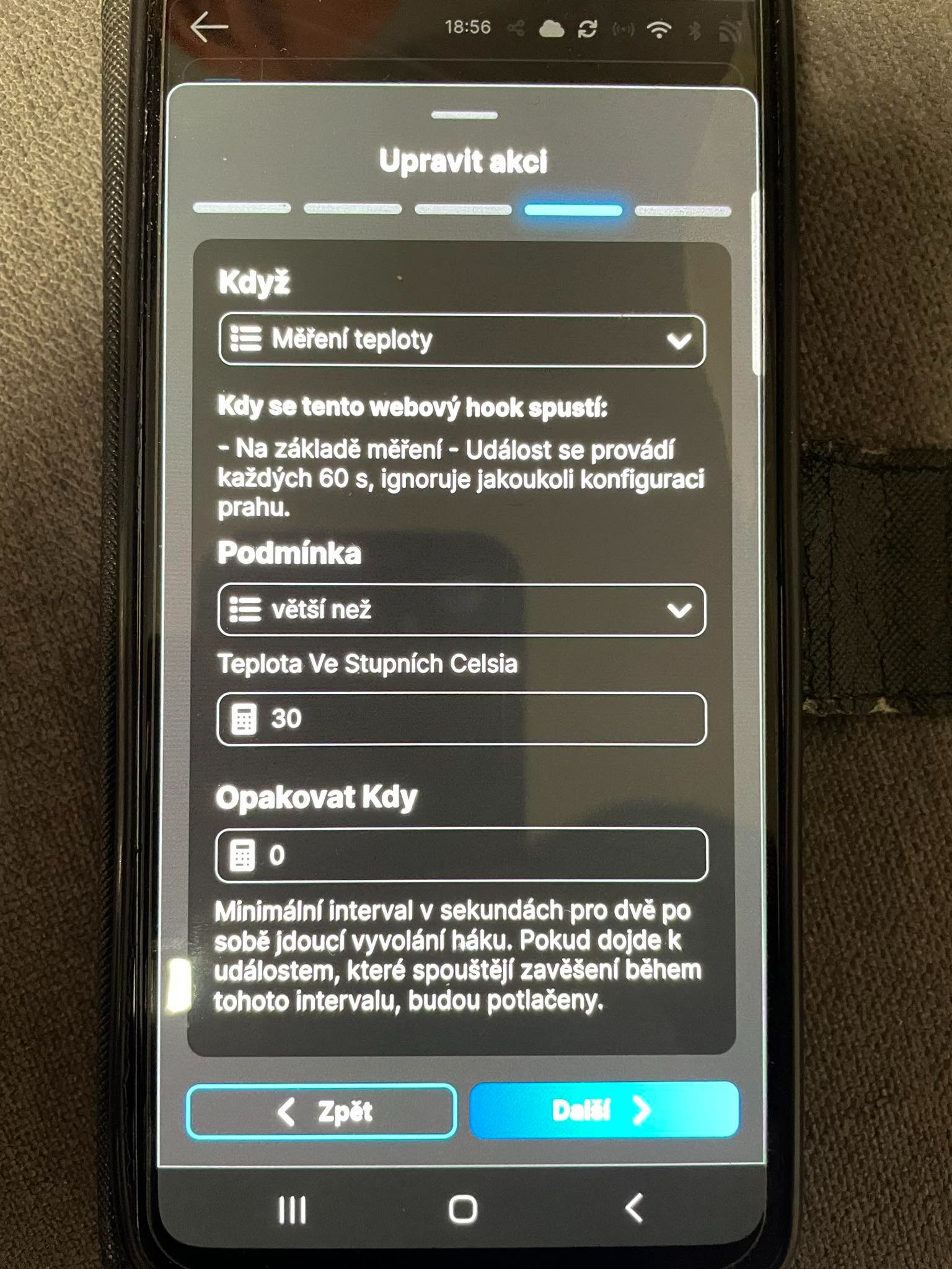 Když (Měření teploty) Podmínka (Větší než) Teplota ve stupních Celsia (30) Opakovat Kdy (0)?