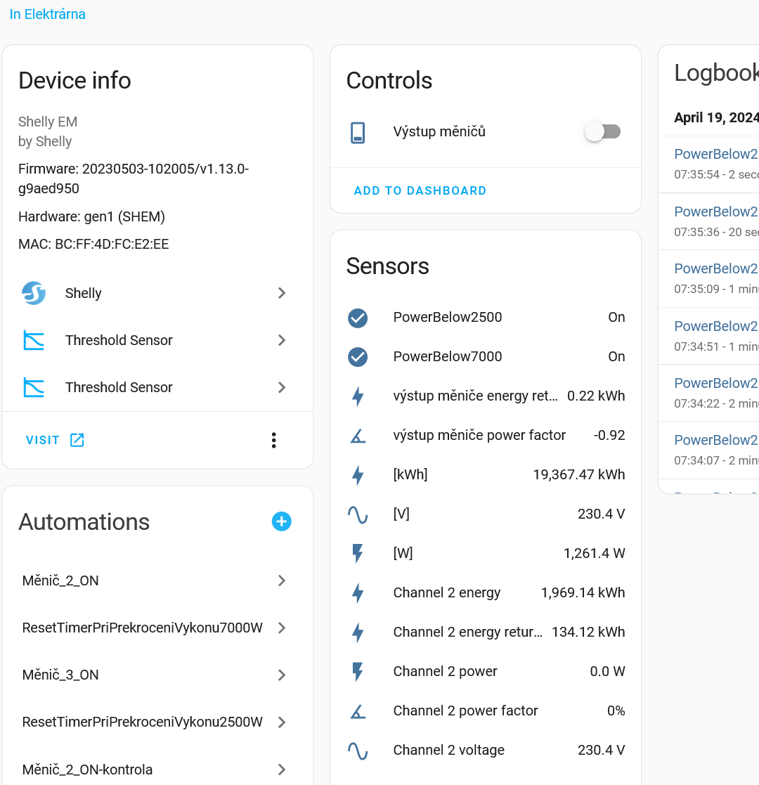 Elektroměry s diplejem jsem v elektrárně nechal, protože když jsem u ní, tak se na údaje mohu podívat (a po staru jednou za čas opsat). Pro monitoring jsem to doplnil Shelly EM - vše je jednofázové a Shelly EM má dvě nacvakávací cívky, jednou měřím výstup měničů, druhou vstup do měničů od distribuce. Je to spolehlivé, snadno integrovatelné do Home Assistant: