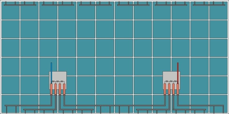 Řeším, zda na jednoduchou 12V aplikaci koupit PWM, nebo MPPT regulátor. Protože je v plánu použít jeden panel se 72články (výstupní napětí cca 45V), provedl jsem na jednom vyřazeném pitvu a zjistil následující propojení. Podle toho, bude stačit přerušit jednu propojku mezi výstupními terminály uprostřed a panel bude rozdělaný na dvě samostatné sekce po cca 22,5V. Ty už lze jednoduše pak propojit paralelně a použít i ten PWM regulátor. Vnitřní propojení přikládám.