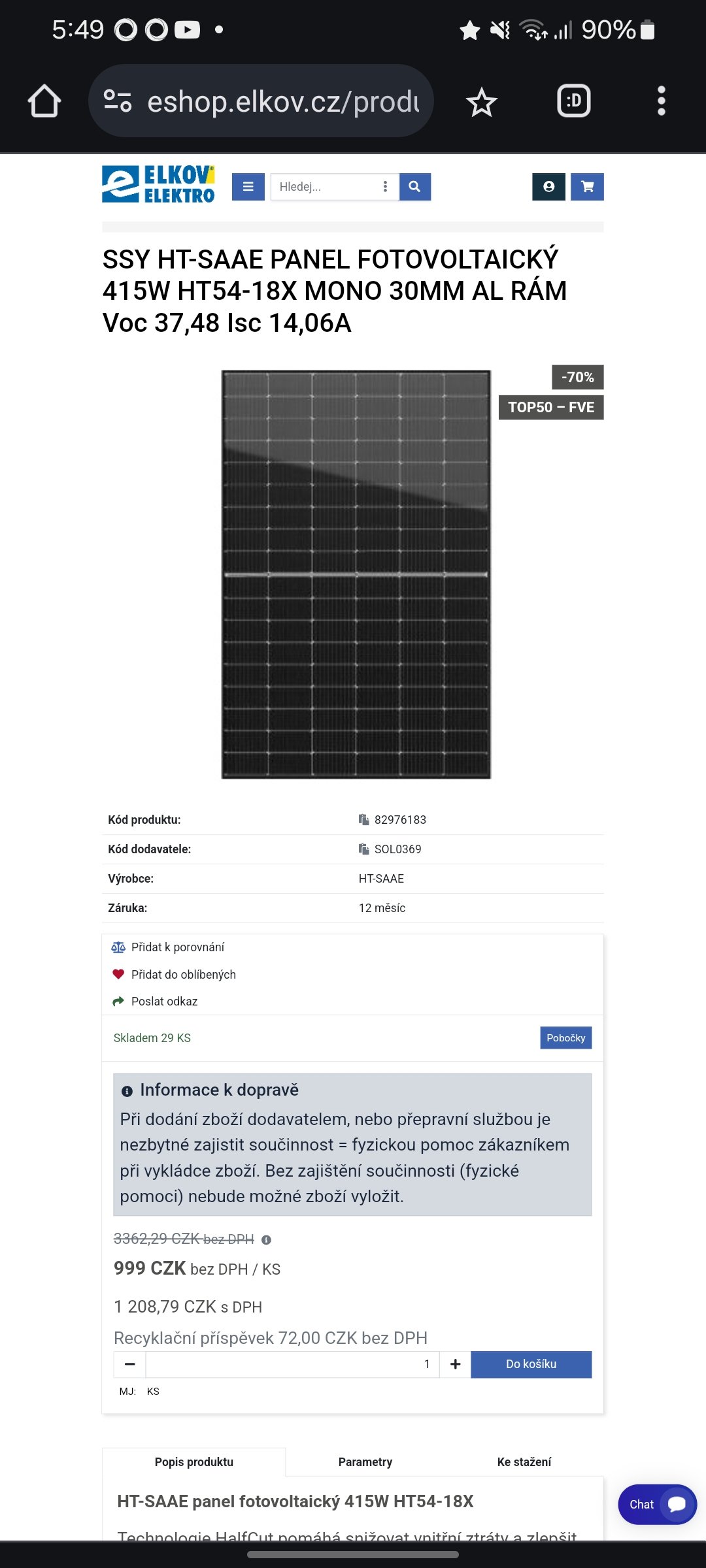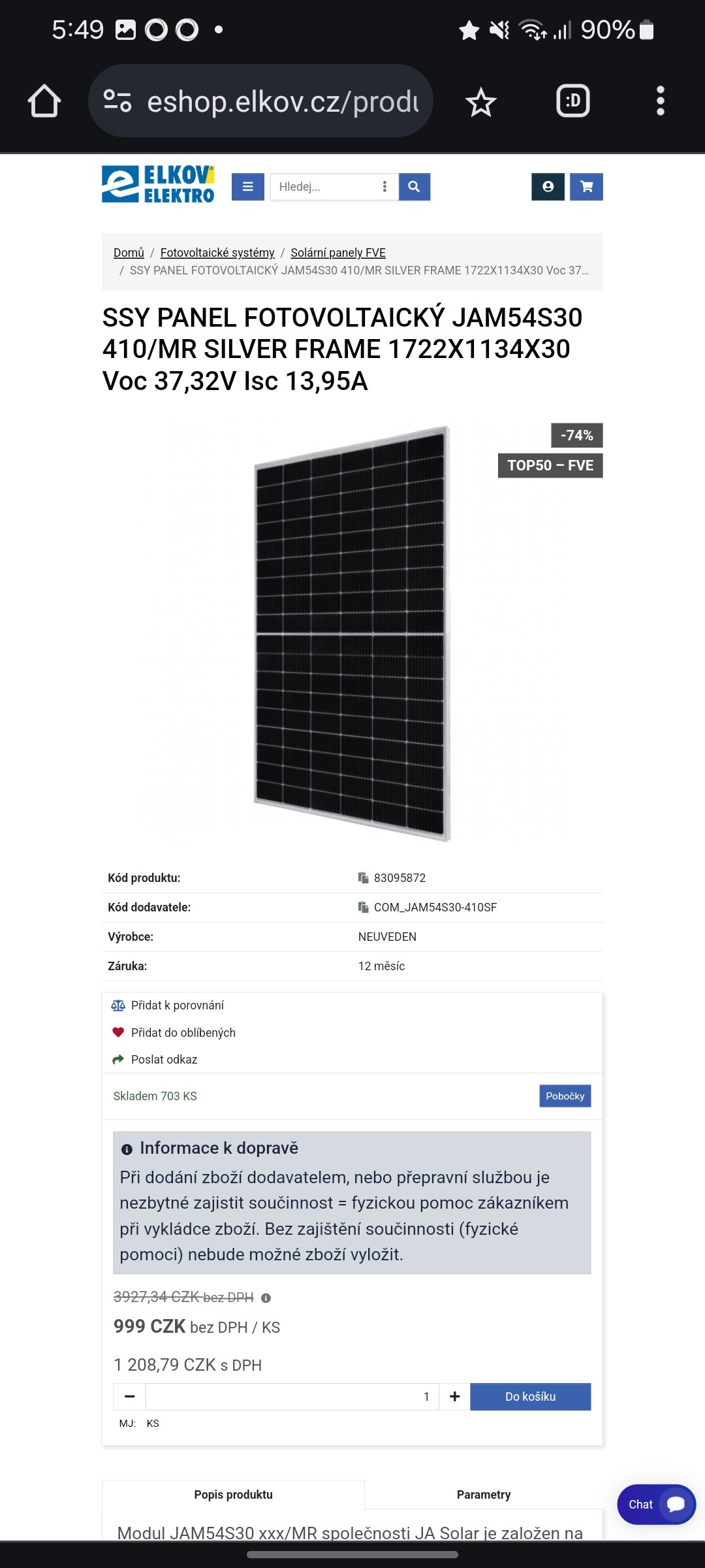 Hlumar má panely Ja Solar 415 Wp za 80€ (2000 Kč).