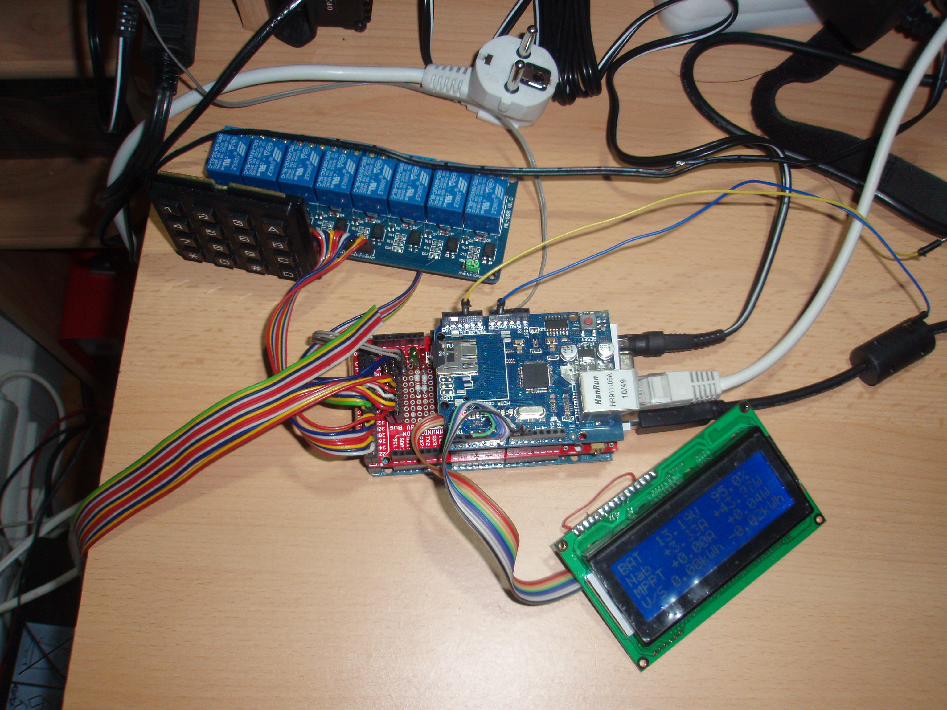 Ovládání je přes malou klávesnišku 4 x 4 tlačitka, mám tam 8 relé, které zatím ovládám přes ta tlačítka (přes WEB na tom pracuji). Displej je 20 x 4, (možná koupím v GME ještě větší) podsvětlení displeje je regulováno přes PWM.