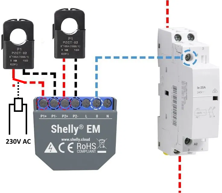 Jestli to chápu správně tak zřejmě máte na mysli odpojování jedné z těch dvou měřících proudových cívek PZCT-2 přerušením třeba toho červeně označeného vodiče mezi cívkou a Shelly EM viz přiložený obrázek, ale nechcete při tom odpojit samotný spotřebič, který se tou cívkou měří tj. nechcete rozpojovat vodič, který bude prostrčený otvorem v té cívce. I když se měří proudy třeba 100A protékající vodičem prostrčeným otvorem v té cívce tak těmi vodiči mezi cívkou a Shelly EM tečou jen minimální proudy cca 100mA. To zvládne odpínat klidně třeba toto malé relé plus patice k němu.ElektroEzs píše: úte srp 06, 2024 5:38 pmPouziju Shelly EM a dve civky s tim ze jednu bych potreboval odepinat relatkem aby za urcite podminky nemerila. Jake vhodne rele s civkou na 230V pouzit?